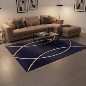 Lacivert Zeminli Altın Kavisli Çizgi Desenli Peluş Halı – Yumuşak Dokulu