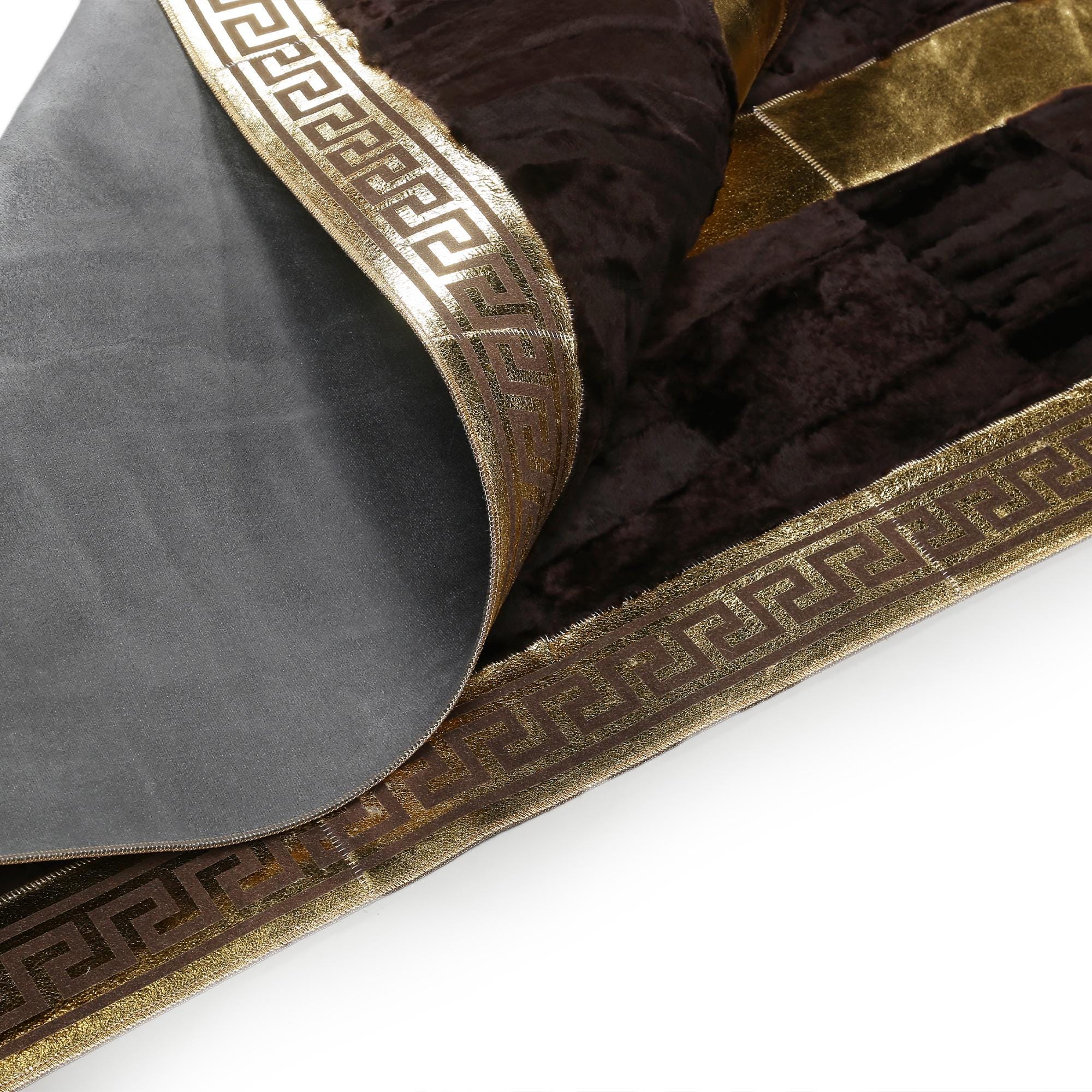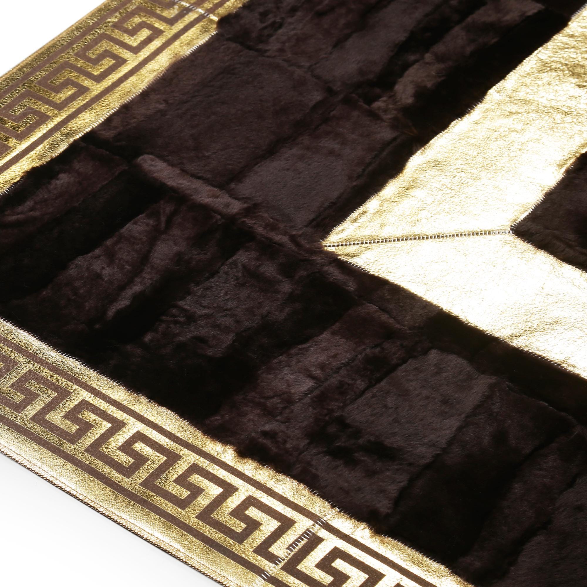 Koyu Kahverengi Toskana Derisi Halı – El Yapımı Patchwork, Altın Bordürlü Hakiki Deri Lüks Salon Halısı