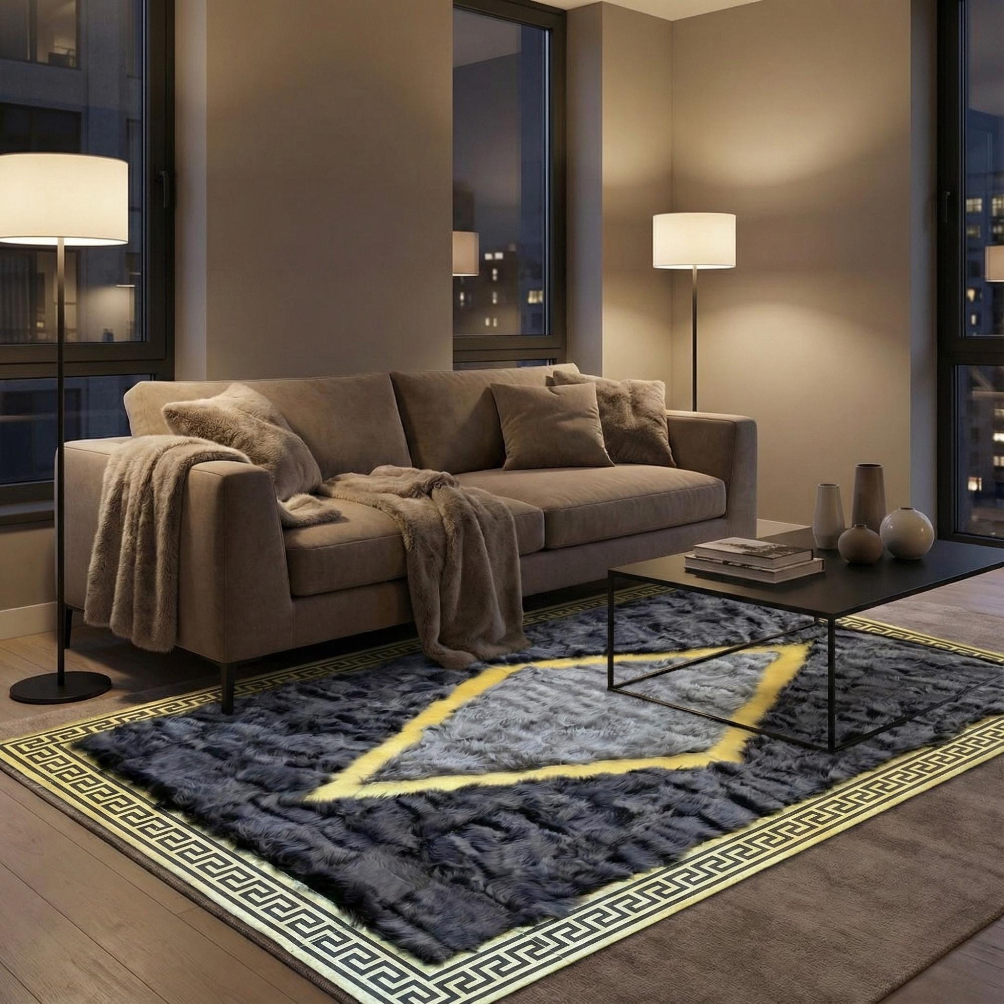 Altın Bordürlü Gri Toscana Kürk Salon Halısı – Klasik ve Lüks Tasarım