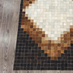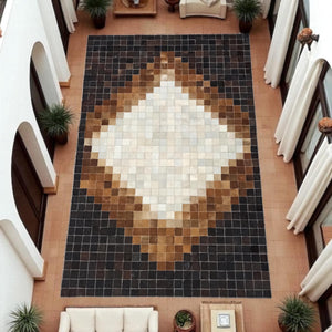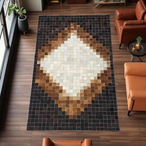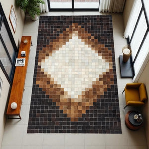 Kahverengi & bej & doğal tonlara sahip bu dana derisi halı, doğal dokusu ve şık görünümüyle dikkat çeker.