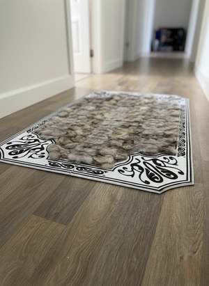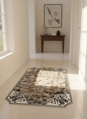 Siyah işlemeli beyaz çerçeve tasarımı, halının doğal tonlarını vurgulayarak güçlü bir görsel kontrast oluşturur. Salon, oturma odası, yatak odası ve antre gibi yaşam alanlarında dekoratif bir vurgu parçası olarak ideal bir seçimdir.
