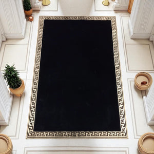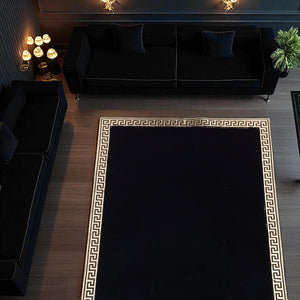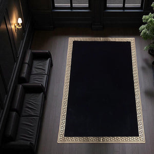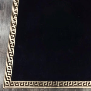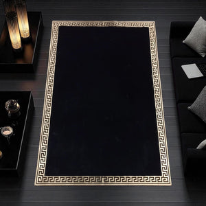 Altın Bordürlü Siyah Peluş Halı – El Yapımı Dekoratif ve Şık Salon Halısı