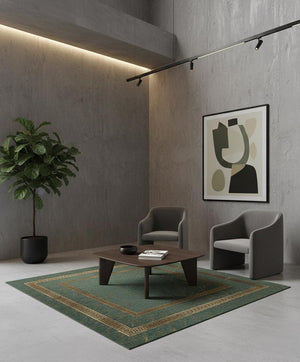 Yeşil tonlar üzerine altın desenli bordür yapısıyla tasarlanan bu peluş halı, doğal renk etkisi ve dengeli kompozisyonuyla mekâna sıcak ve karakterli bir görünüm kazandırır. Merkezdeki sade yüzey, bordür boyunca devam eden desenlerle çerçevelenirken halının formu net ve düzenli bir şekilde vurgulanır.