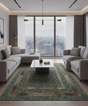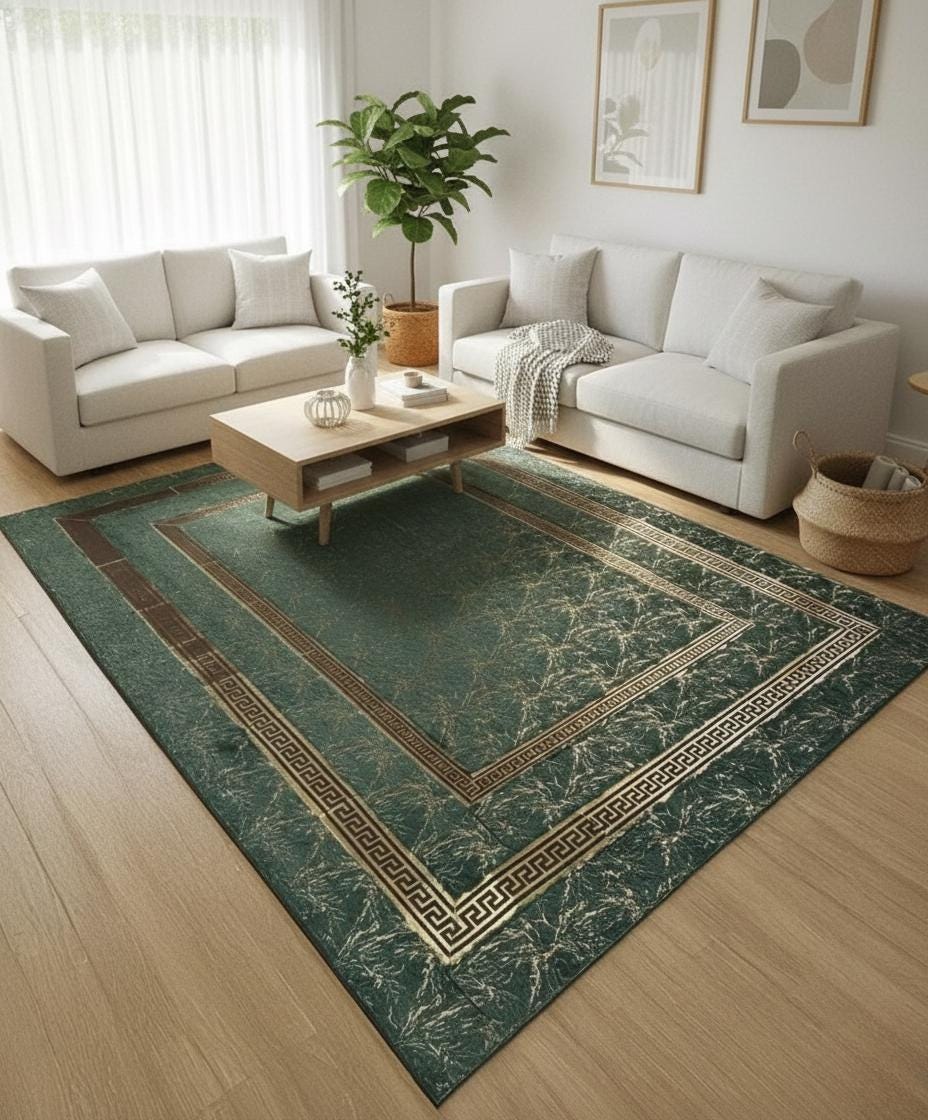 Yeşil Zeminli Desenli Altın Bordürlü Peluş Halı – Yumuşak Dokulu, Modern ve Dekoratif Halı