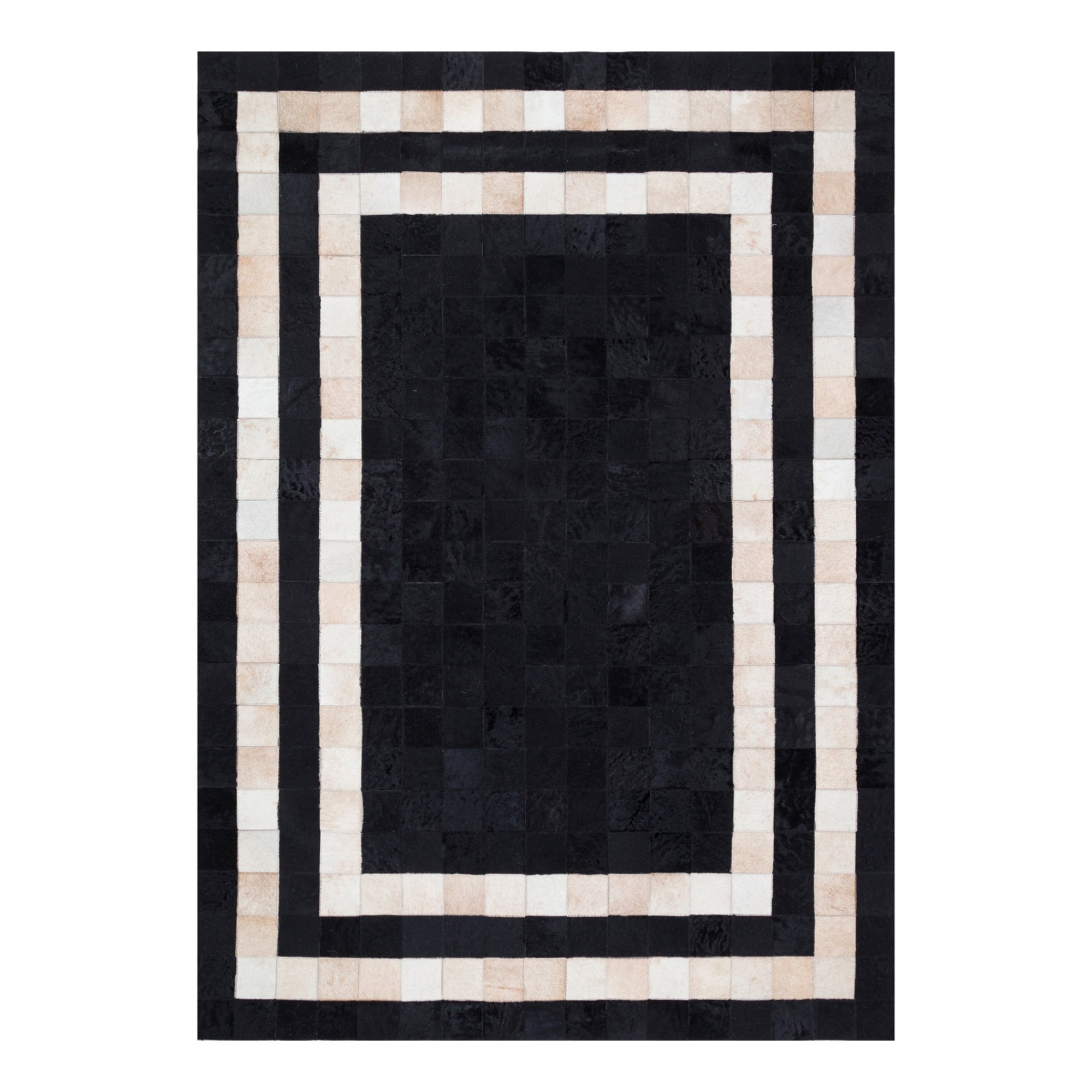 Siyah & bej tonlara sahip bu dana derisi halı, doğal dokusu ve şık görünümüyle dikkat çeker.