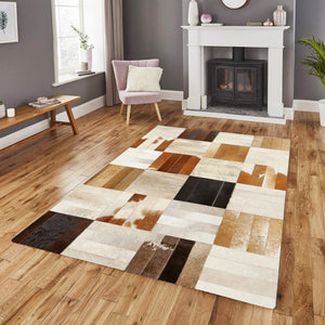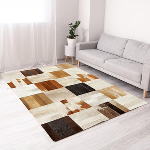 Kahve Tonlu Doğal Dana Derisi Patchwork Halı – El Yapımı Hakiki Deri Şık Salon Halısı