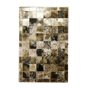 Kahverengi & altın tonlara sahip bu dana derisi halı, doğal dokusu ve şık görünümüyle dikkat çeker.