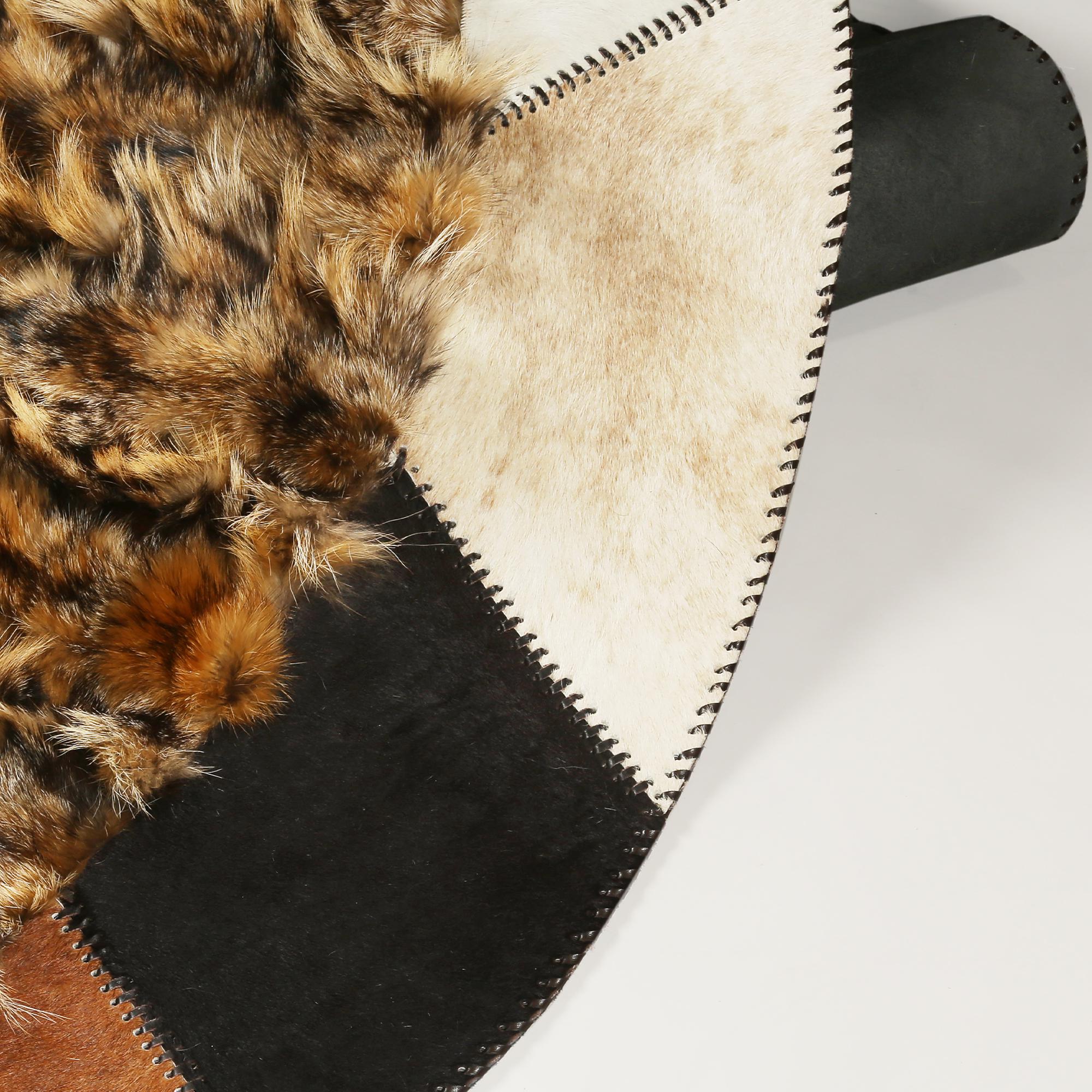 Siyah Kahverengi Geometrik Tilki Kürkü Yuvarlak Halı, özenle seçilmiş gerçek tilki kürkünden üretilmiş yuvarlak bir tasarıma sahiptir. Zarif görünümü ve yumuşak yapısıyla dikkat çeker.
