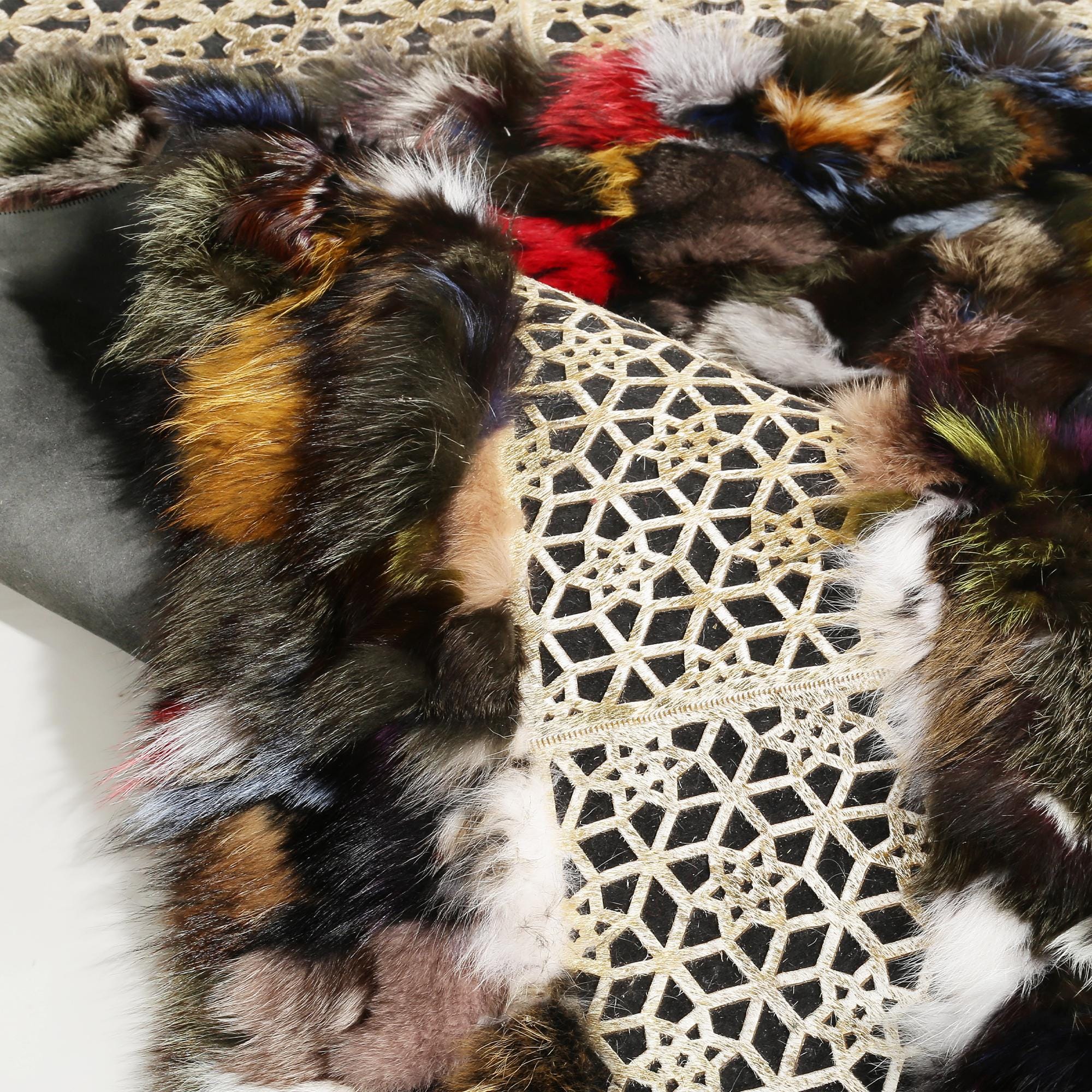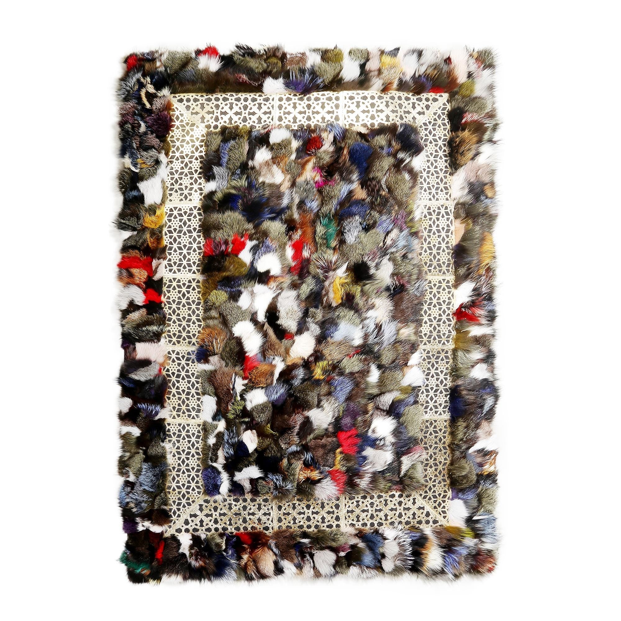 Renkli Dantel Kenarlı Tilki Kürkü Halı – El Yapımı Doğal Kürk Ortam Halısı
