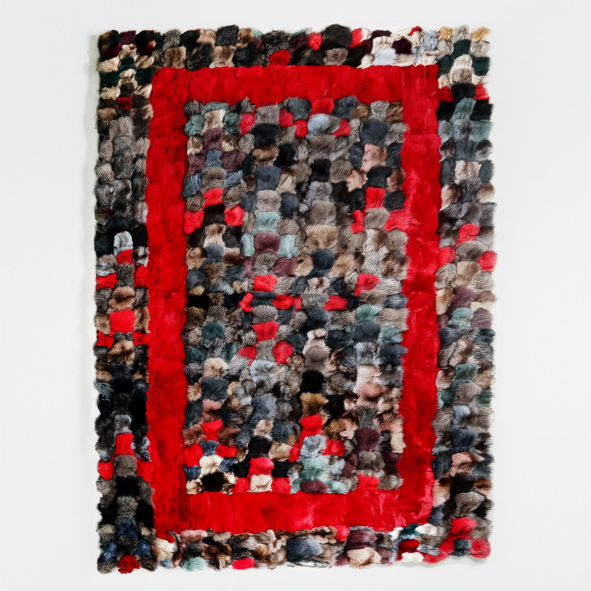 Çok Renkli Kırmızı Çerçeveli Tilki Kürkü Halı – El Yapımı Doğal Kürk Salon Halısı