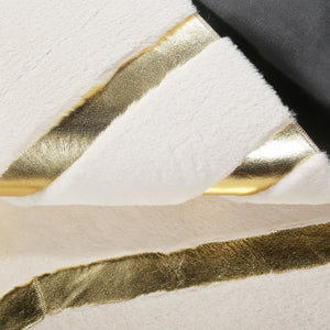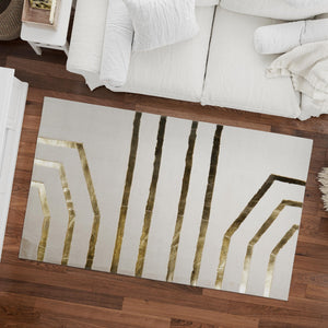 Bu krem zemin üzerine altın çizgili peluş halı, modern çizgileriyle öne çıkar. Yumuşak dokusu ve dayanıklı yapısıyla hem şıklık hem de rahatlık sunar.