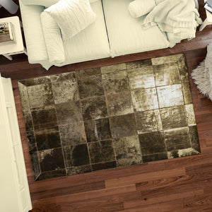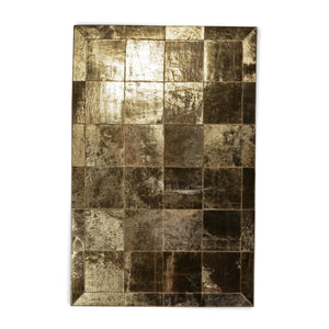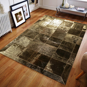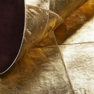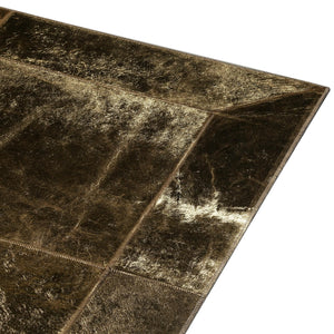 Kahverengi & altın tonlara sahip bu dana derisi halı, doğal dokusu ve şık görünümüyle dikkat çeker.