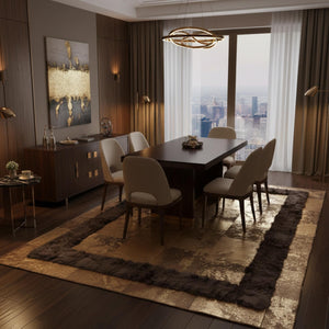Bej ve kahverengi tonların merkezde açık, kenarlarda koyu çerçeve etkisi oluşturacak şekilde kullanıldığı dana derisi patchwork halı, düzenli kare yapısıyla güçlü ve dengeli bir zemin görünümü sunar. Gerçek dana derisinden üretilen bu halı, doğal renk geçişleri sayesinde mekâna sıcak ve bütünlüklü bir atmosfer kazandırır.
