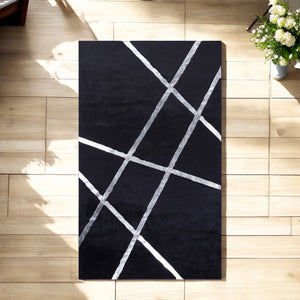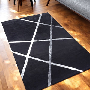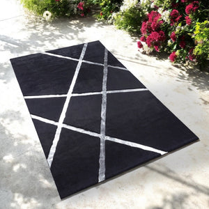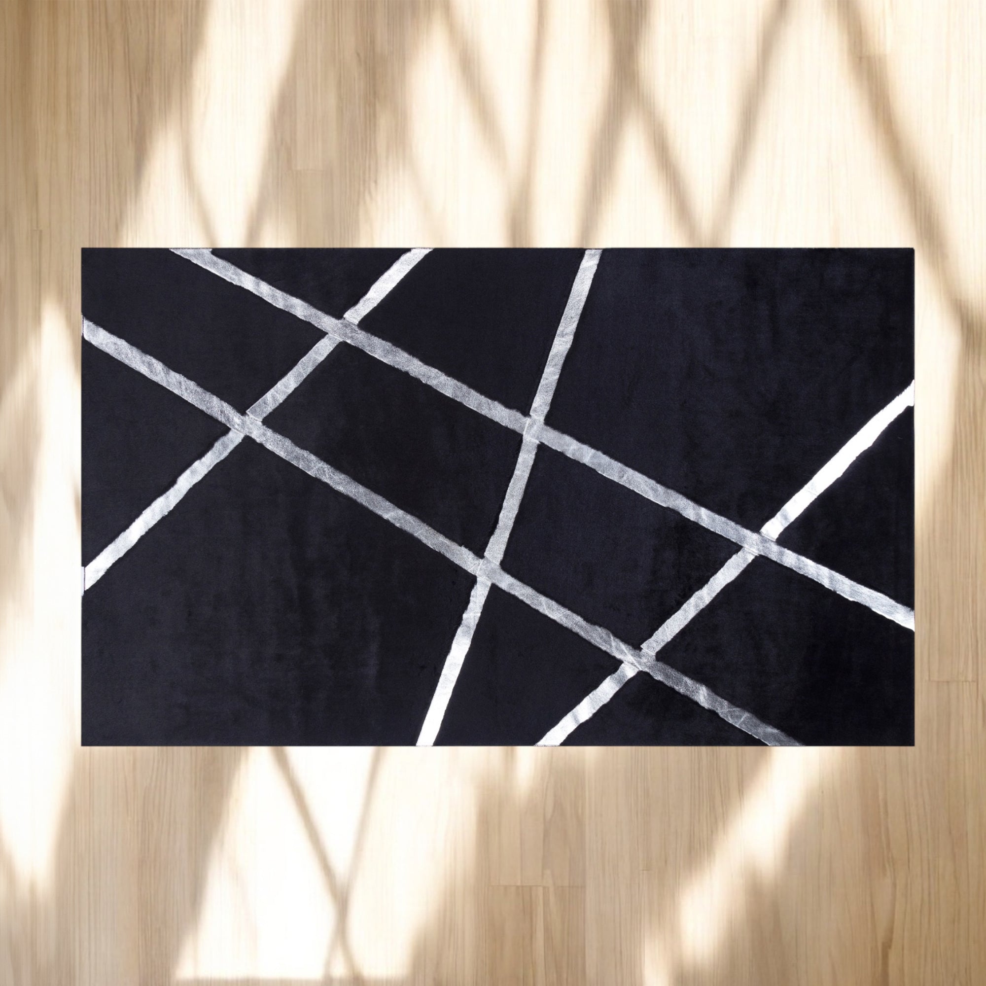 Gümüş çizgilerle zenginleştirilmiş bu siyah peluş halı, modern ve sade dekorasyonlar için ideal bir parçadır.