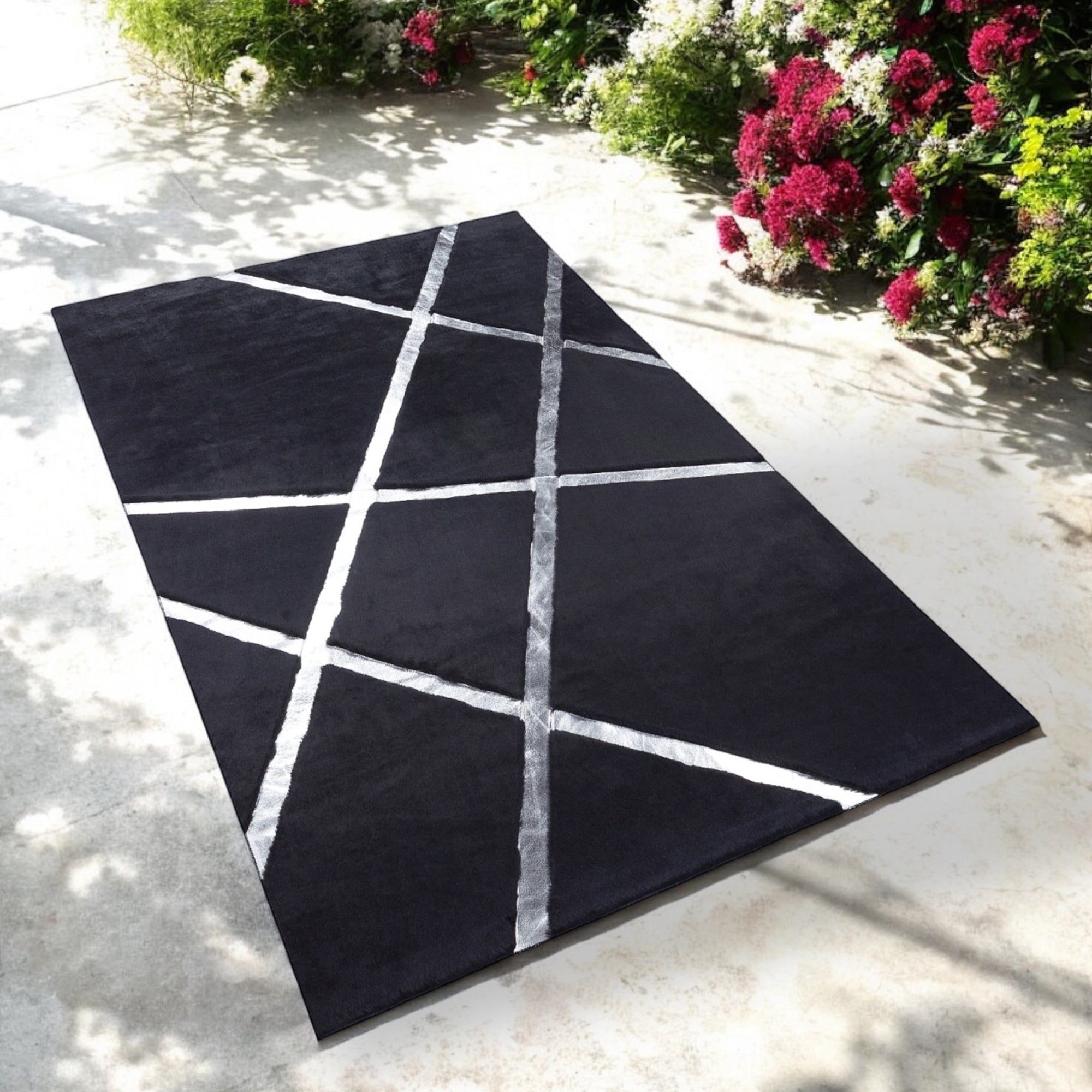 Bu siyah zemin üzerine gri çizgili peluş halı, modern geometrik tasarımıyla öne çıkar. Yumuşak dokusu ve dayanıklı yapısıyla şıklığı ve konforu bir araya getirir.