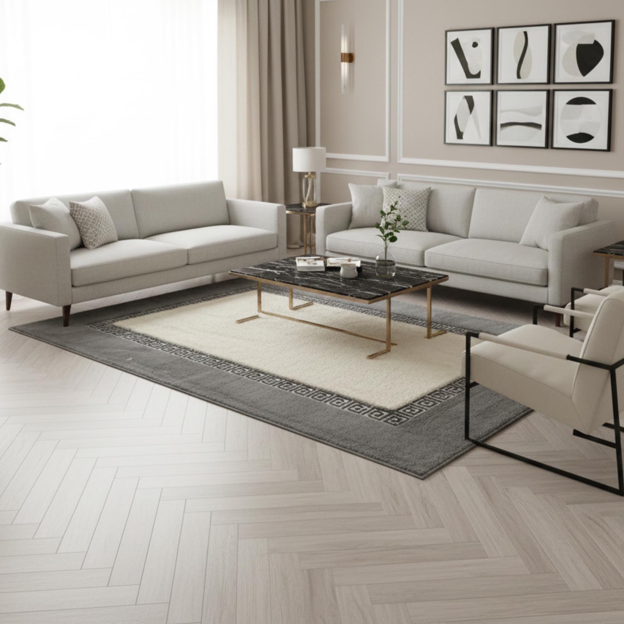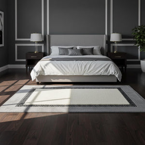Gri Zeminli Beyaz Merkezli ve Silver Bordürlü Peluş Halı – Yumuşak Dokulu, Modern ve Dekoratif Halı