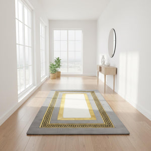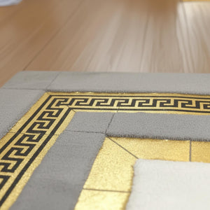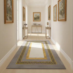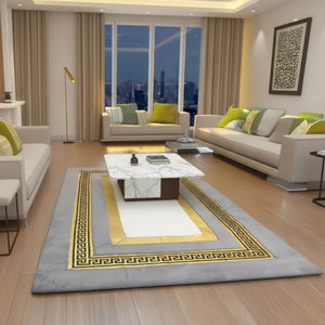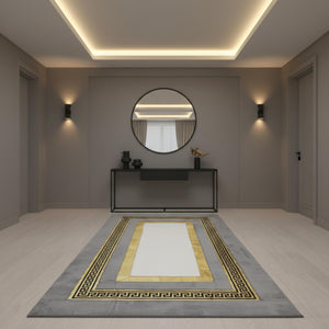 Gri Zeminli Altın Klasik Bordür Detaylı Peluş Halı – Yumuşak Dokulu, Şık ve Dekoratif Halı