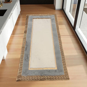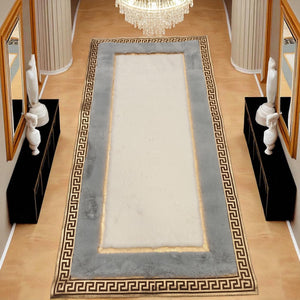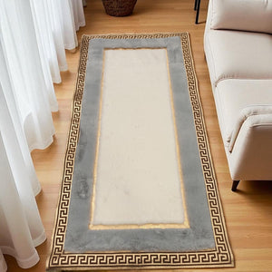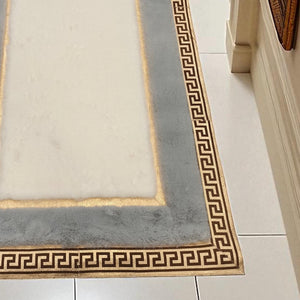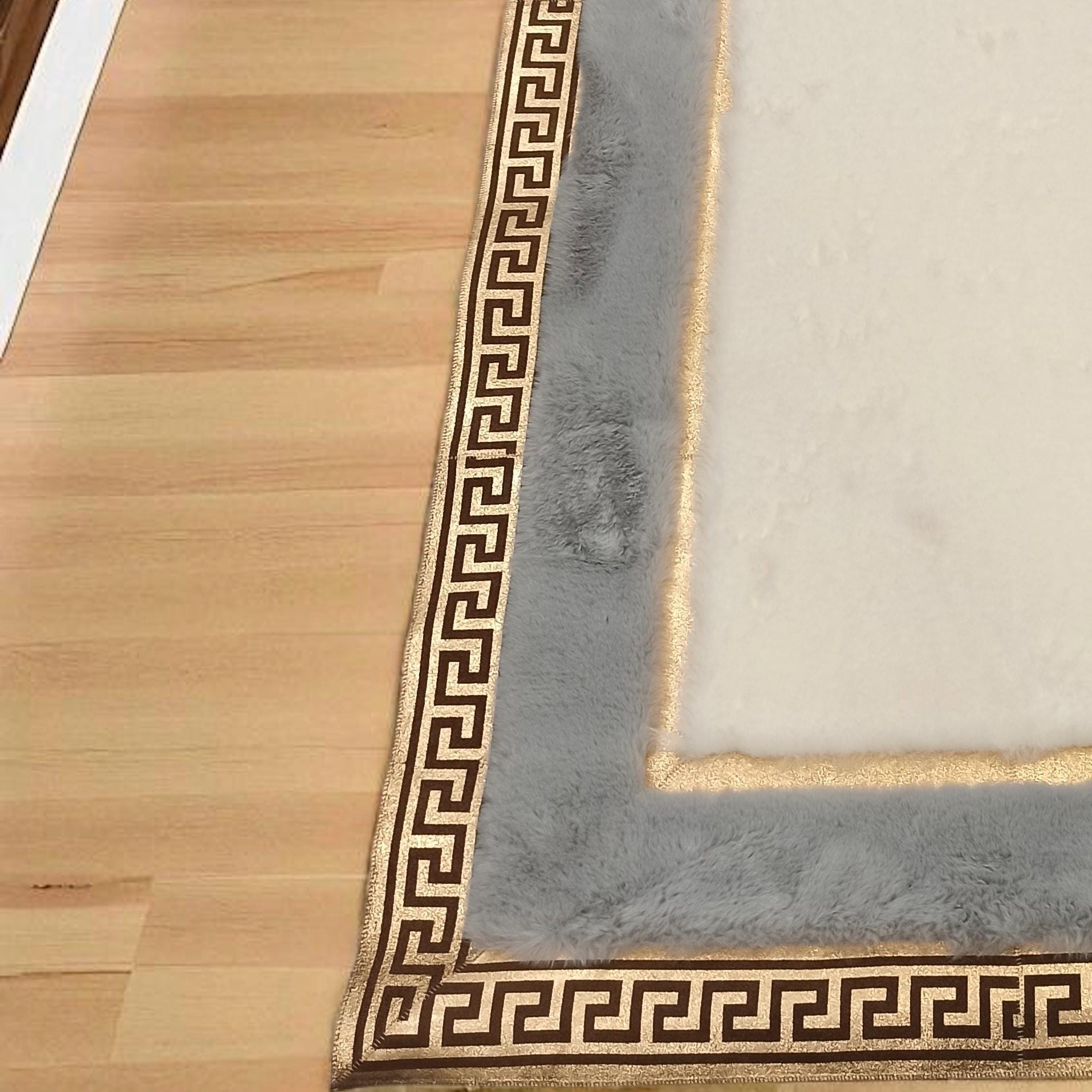 Altın Bordürlü Gri Beyaz Peluş Halı – El Yapımı Yumuşak ve Şık Ortam Halısı