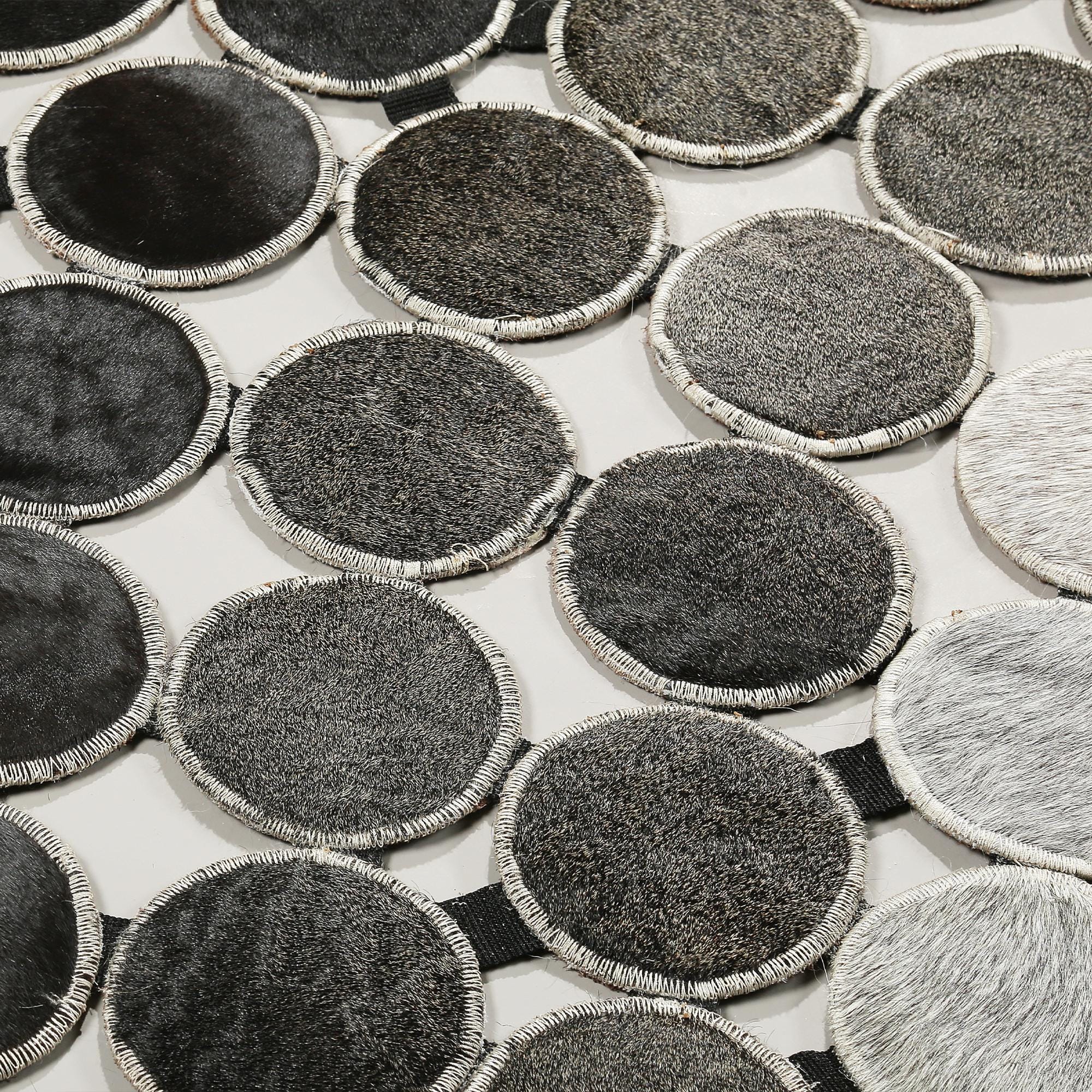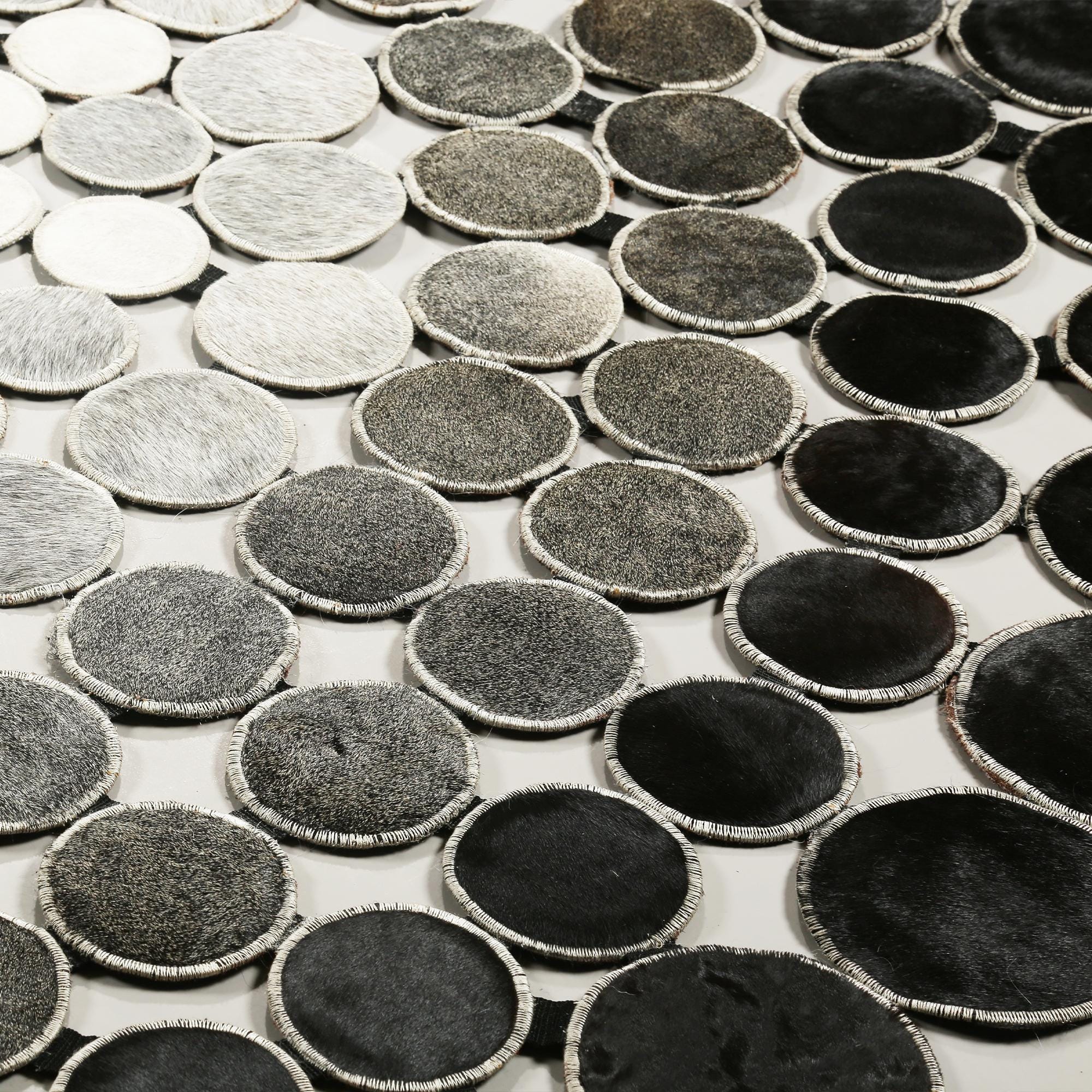 Puantiyeli tasarımıyla dikkat çeken bu yuvarlak dana derisi halı, el işçiliğiyle üretilmiştir.