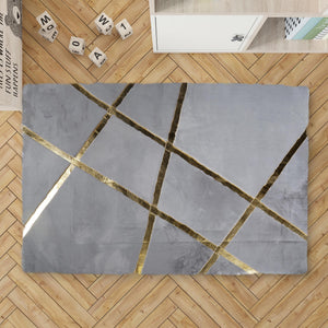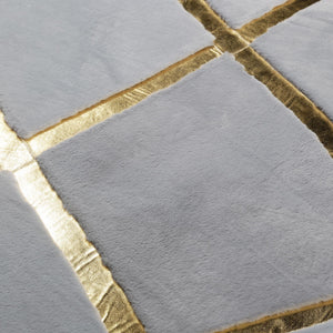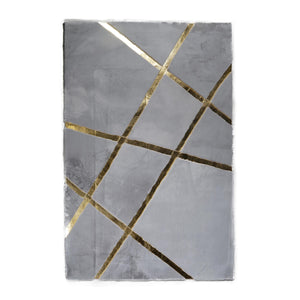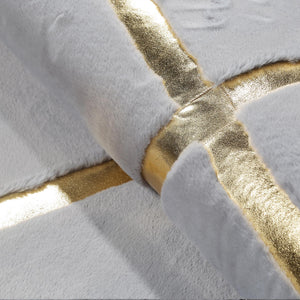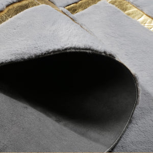 Bu gri zemin üzerine altın çizgili peluş halı, modern tasarımıyla dikkat çeker. Yumuşak dokusu ve dayanıklı yapısıyla hem estetik hem de konfor sunar.