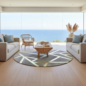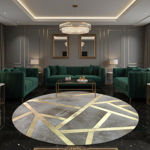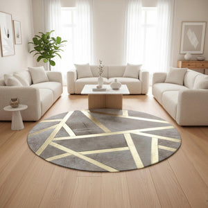 Gri Zeminli Altın Çizgi Desenli Yuvarlak Dana Derisi Patchwork Halı