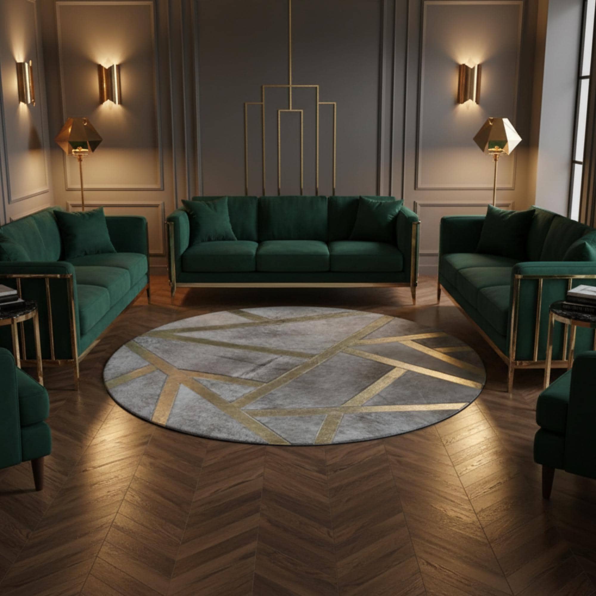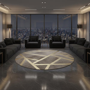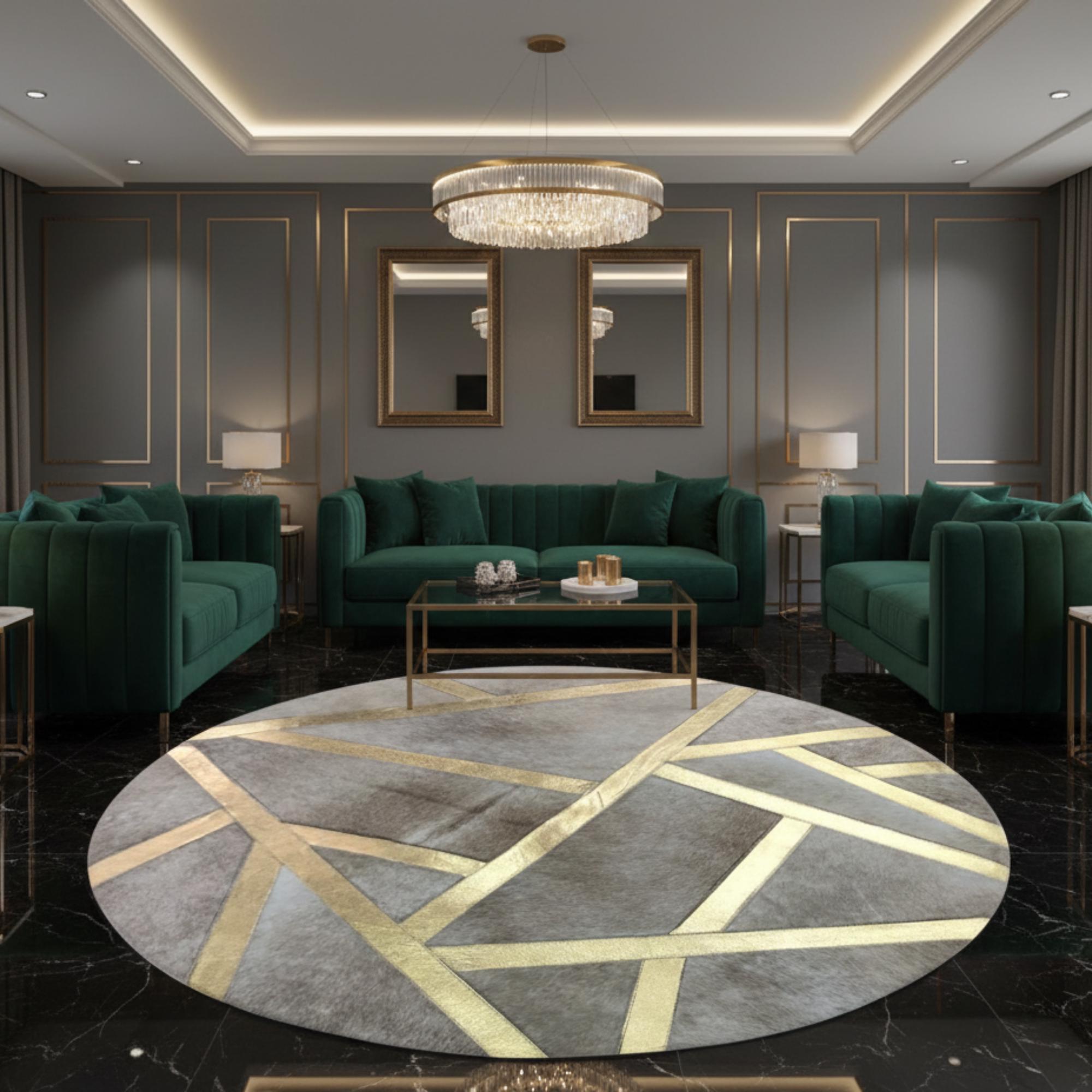 Gri tonlarındaki dana derisi yüzey üzerine altın çizgisel desenlerle tasarlanan bu yuvarlak patchwork halı, sade zemin ile dikkat çekici detayları dengeli biçimde bir araya getirir. Çizgi desenler yüzeyde net bir düzen oluştururken, yuvarlak form mekânda akıcı ve dengeli bir görünüm sağlar.