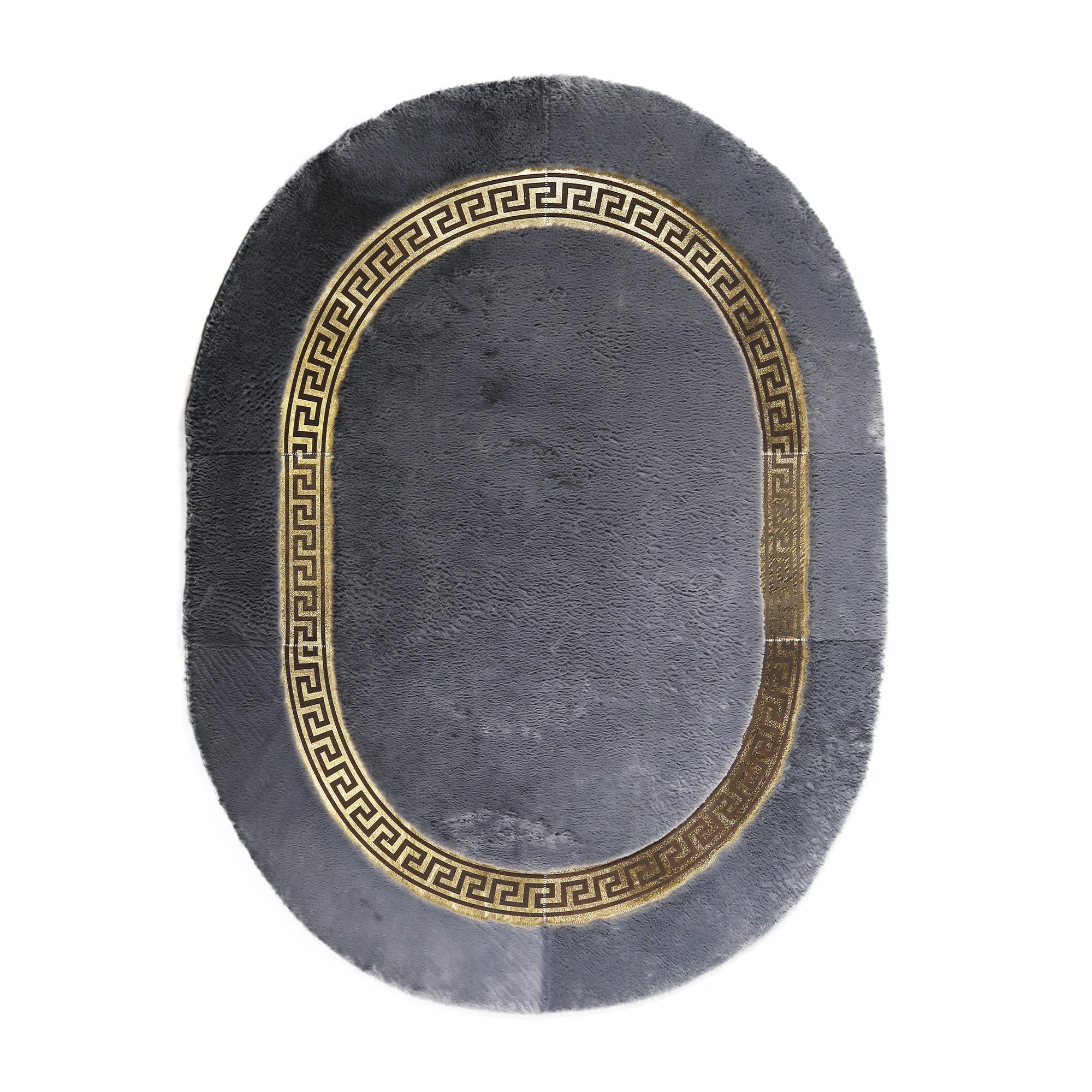 Bu gri oval peluş halı, altın bordürlü modern tasarımıyla dikkat çeker. Yumuşak dokusu ve dayanıklı yapısıyla her mekâna şıklık ve konfor katar.