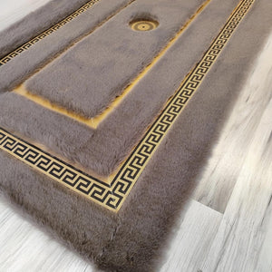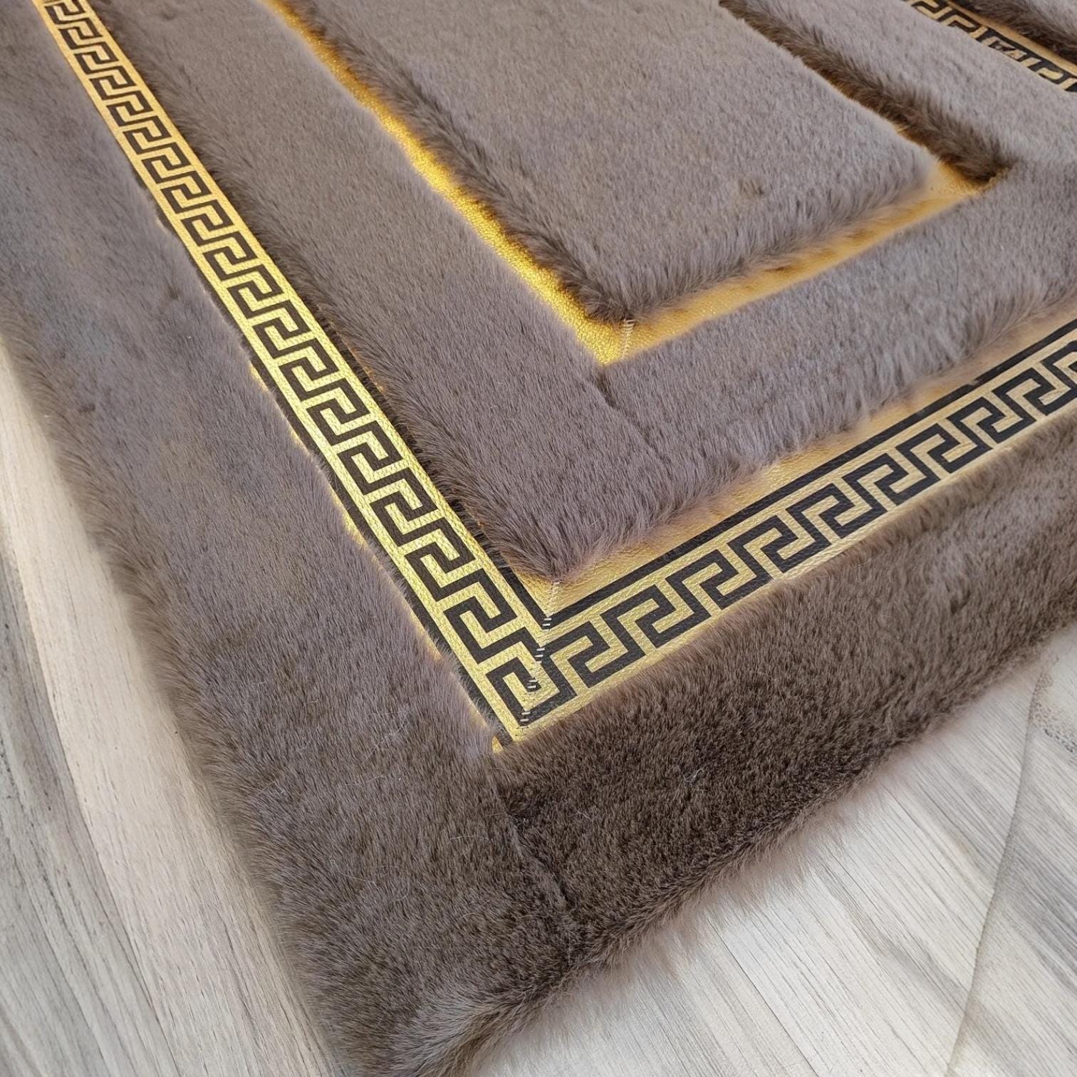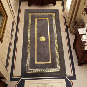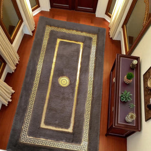 Altın Bordürlü Koyu Gri Peluş Halı – El Yapımı Modern ve Şık Salon Halısı
