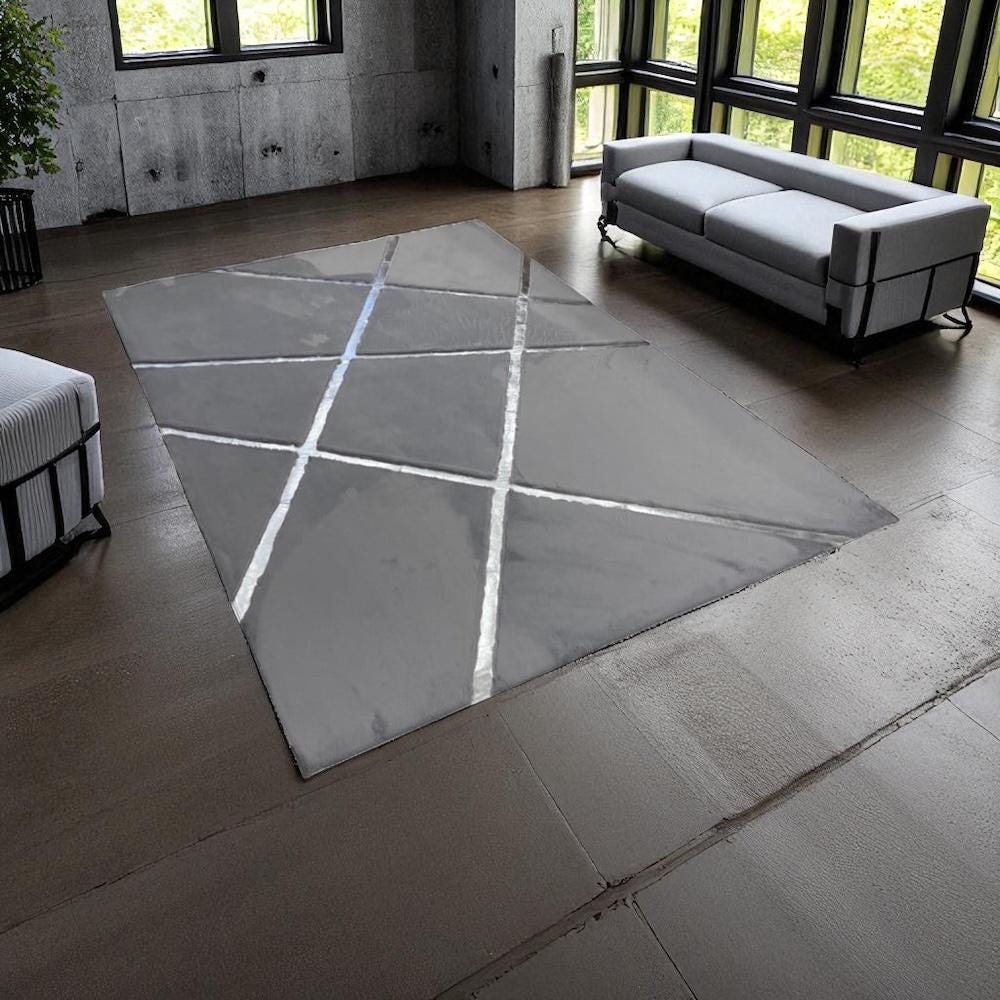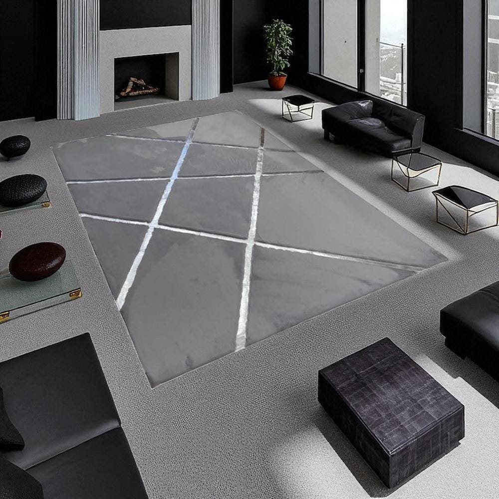 Bu gri zemin üzerine gümüş çizgili peluş halı, modern geometrik tasarımıyla öne çıkar. Yumuşak dokusu ve dayanıklı yapısıyla hem şıklık hem de konfor sunar.