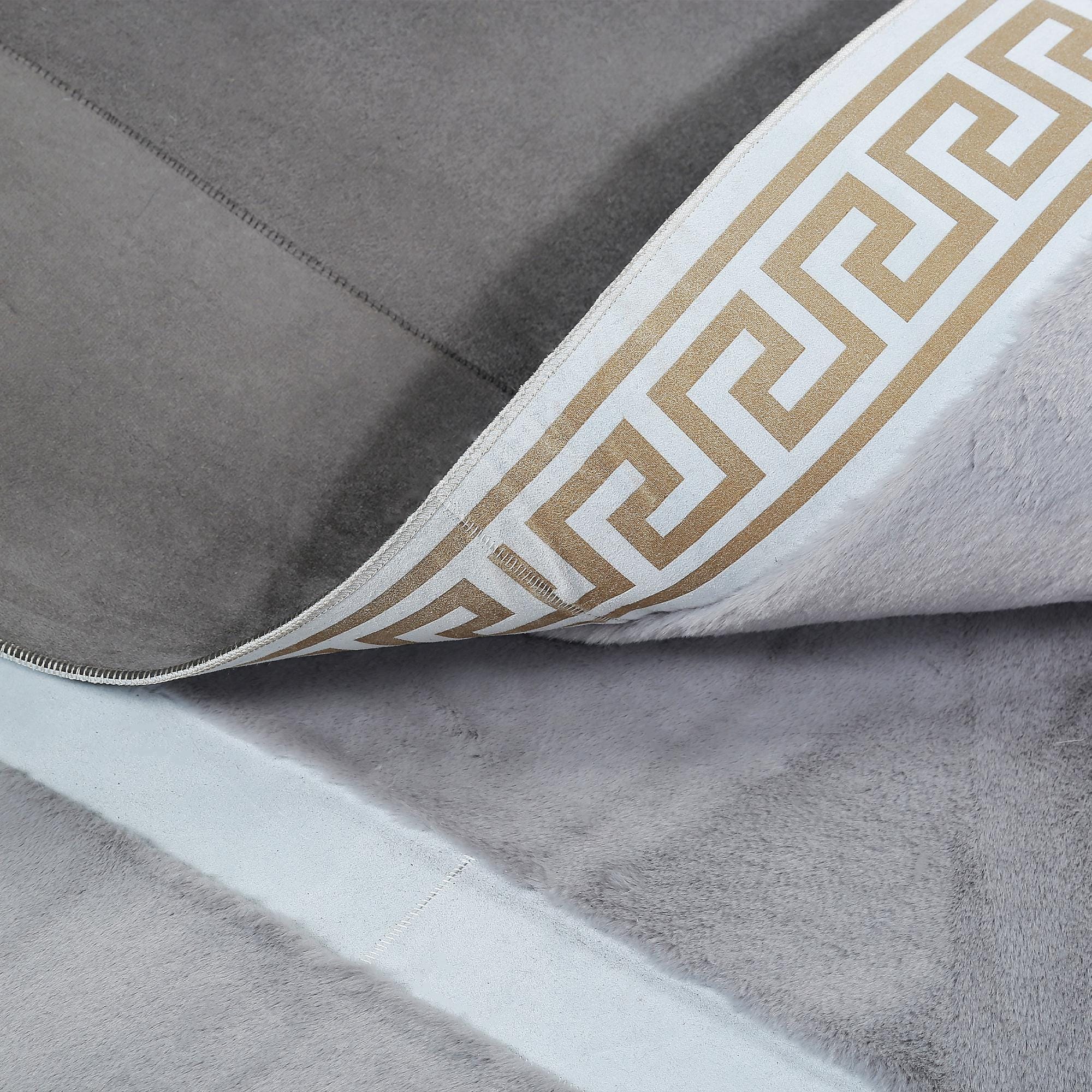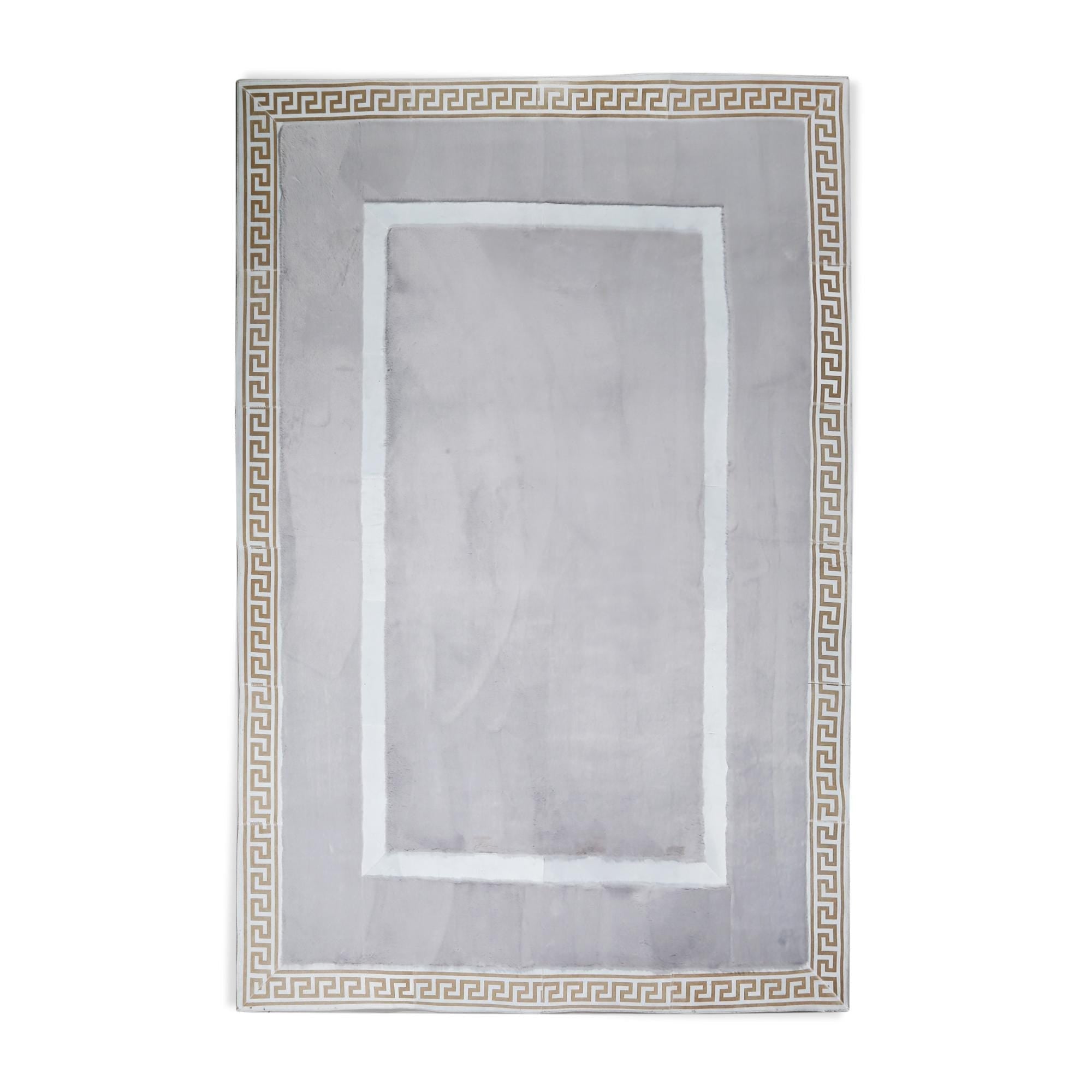 Bu gri peluş halı, altın bordürlü modern tasarımıyla şıklığı ve konforu bir arada sunar. Yumuşak dokusu ve dayanıklı yapısıyla uzun süreli kullanım sağlar.
