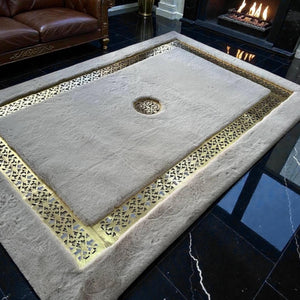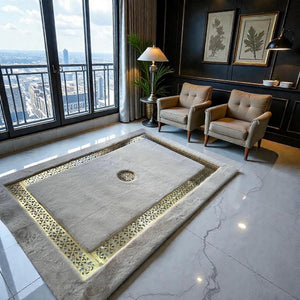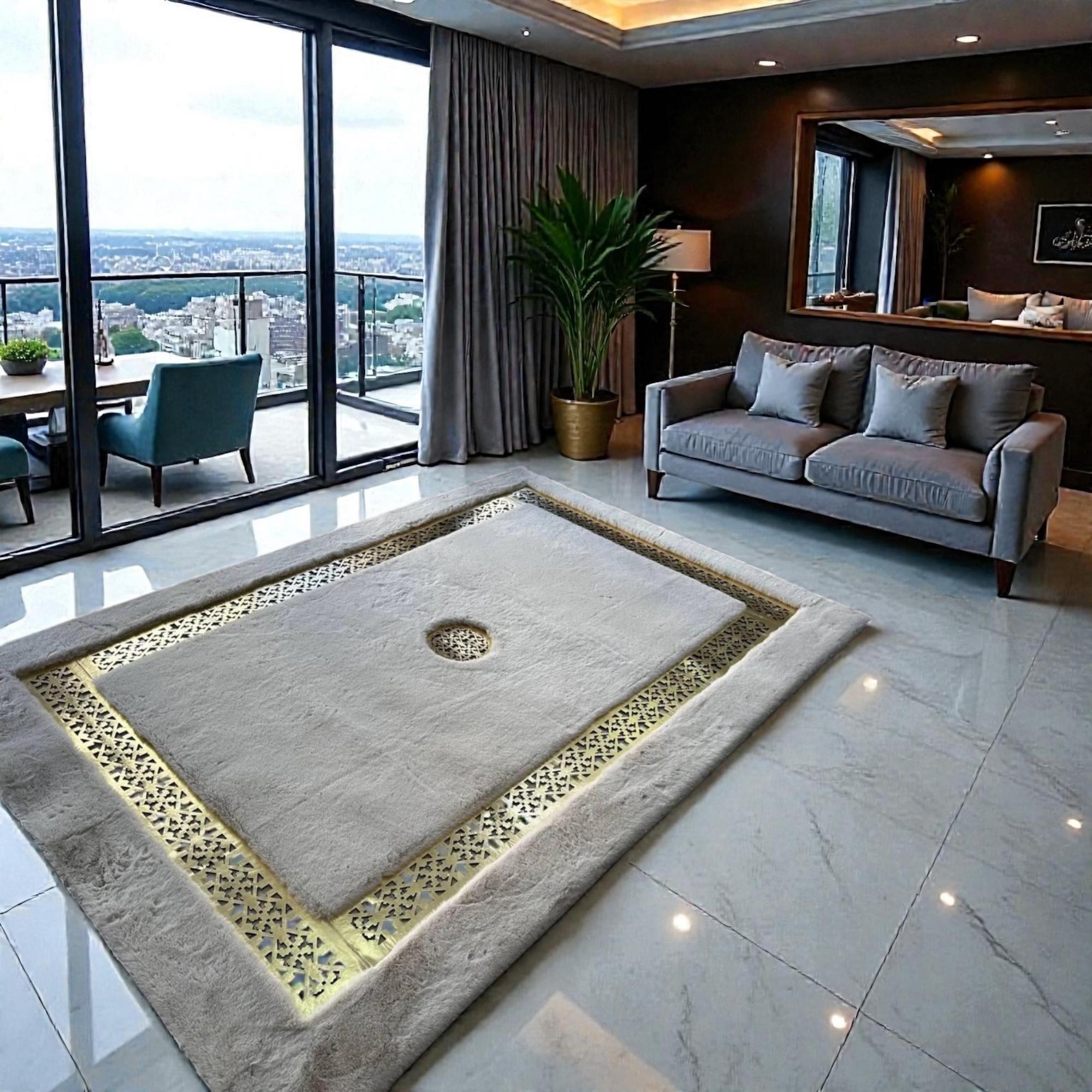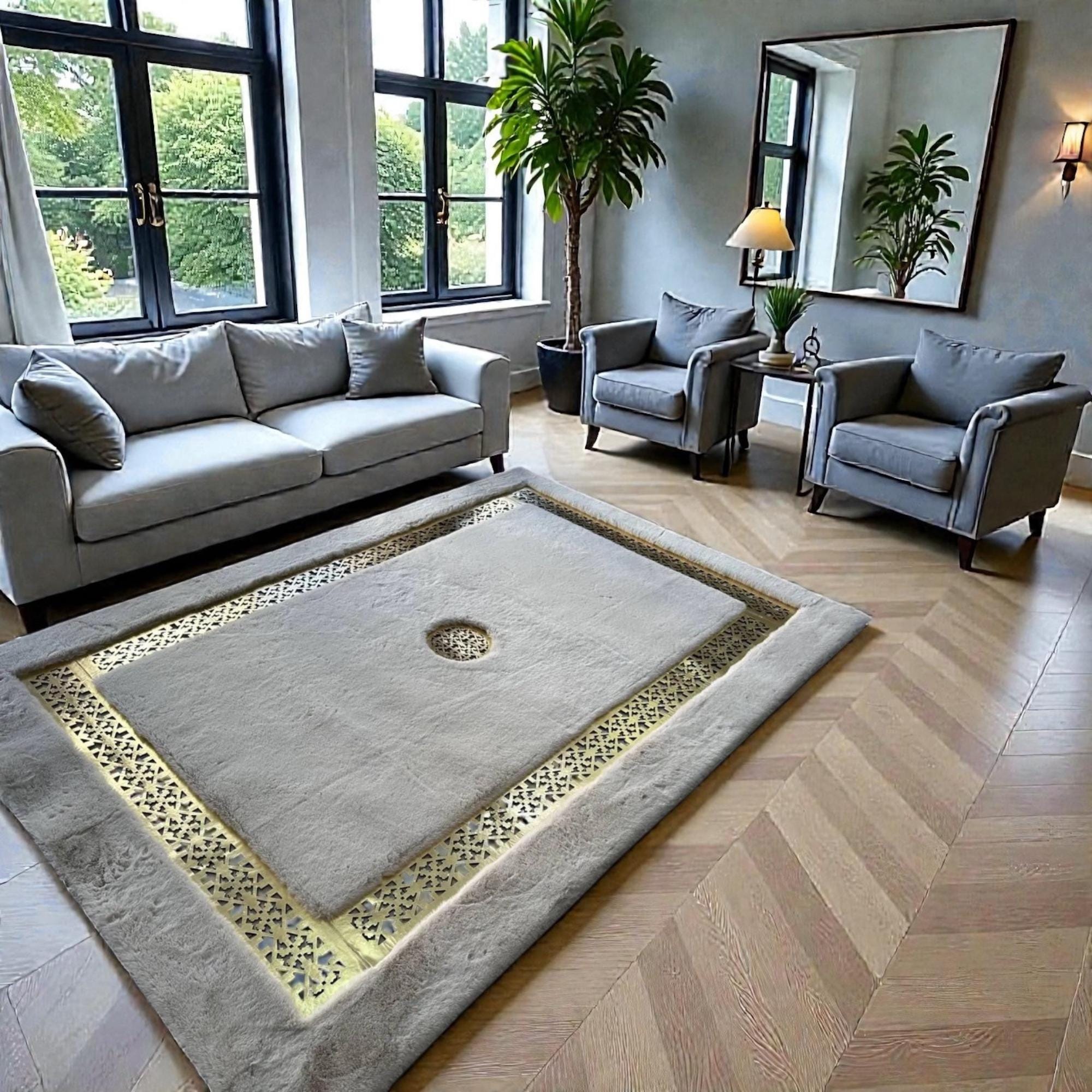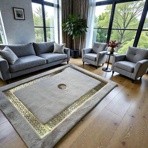 Bej zemin üzerine merkezde konumlandırılmış altın motif ve çevresini saran geniş altın bordür detaylarıyla tasarlanan bu peluş halı, sıcak renk dengesi ve simetrik kompozisyonuyla mekâna zarif ve dengeli bir görünüm kazandırır. Geniş bordür yapısı halının çerçevesini belirginleştirirken, sade merkez alan mekânda net bir odak noktası oluşturur.