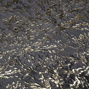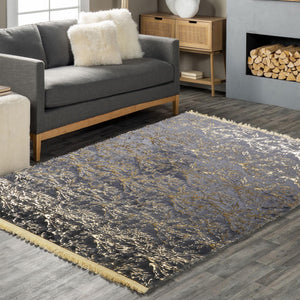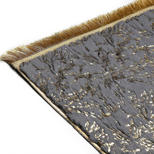 Bu gri zemin üzerine altın desenli peluş halı, püsküllü kenar tasarımıyla dikkat çeker. Yumuşak dokusu ve dayanıklı yapısıyla her mekâna şıklık ve konfor katar.