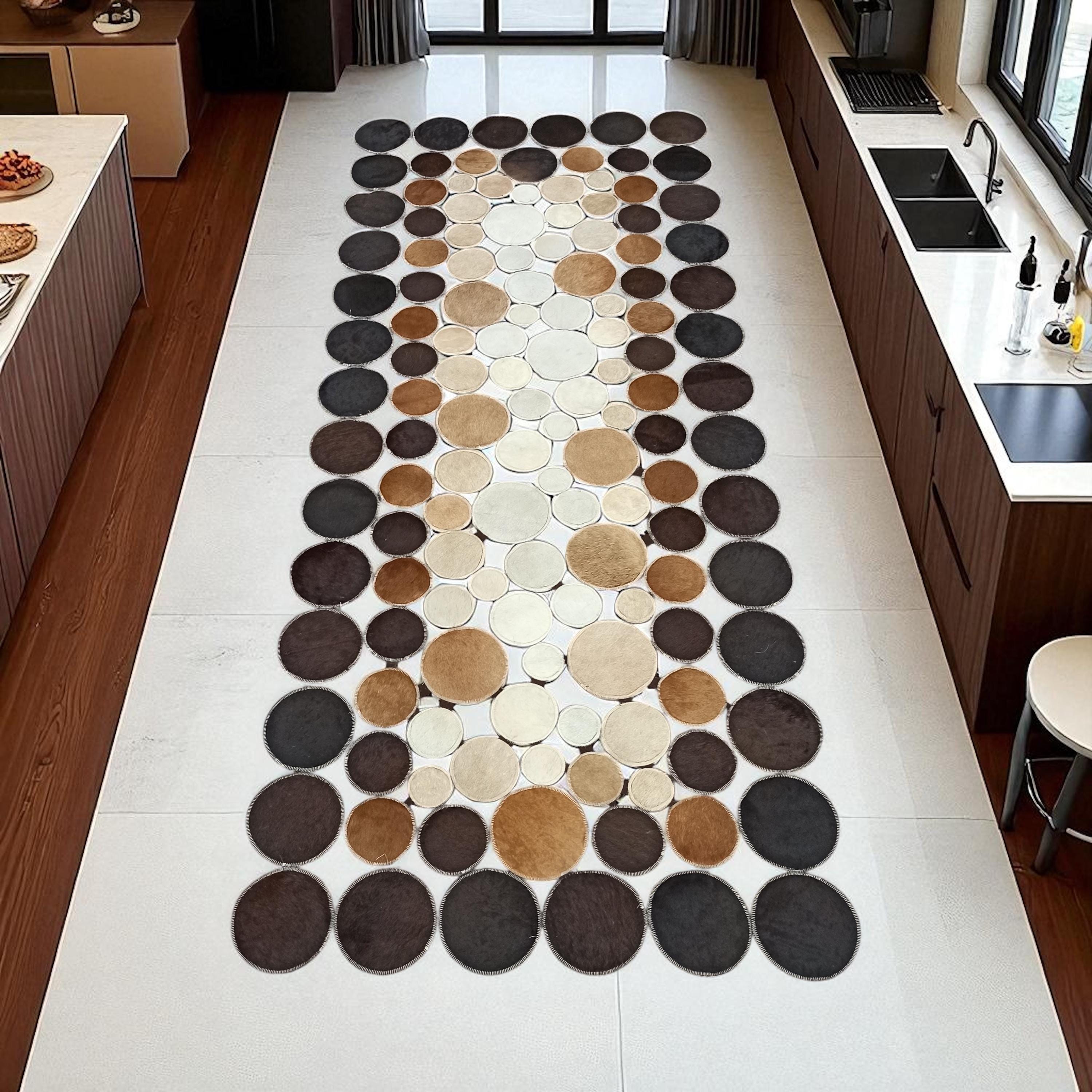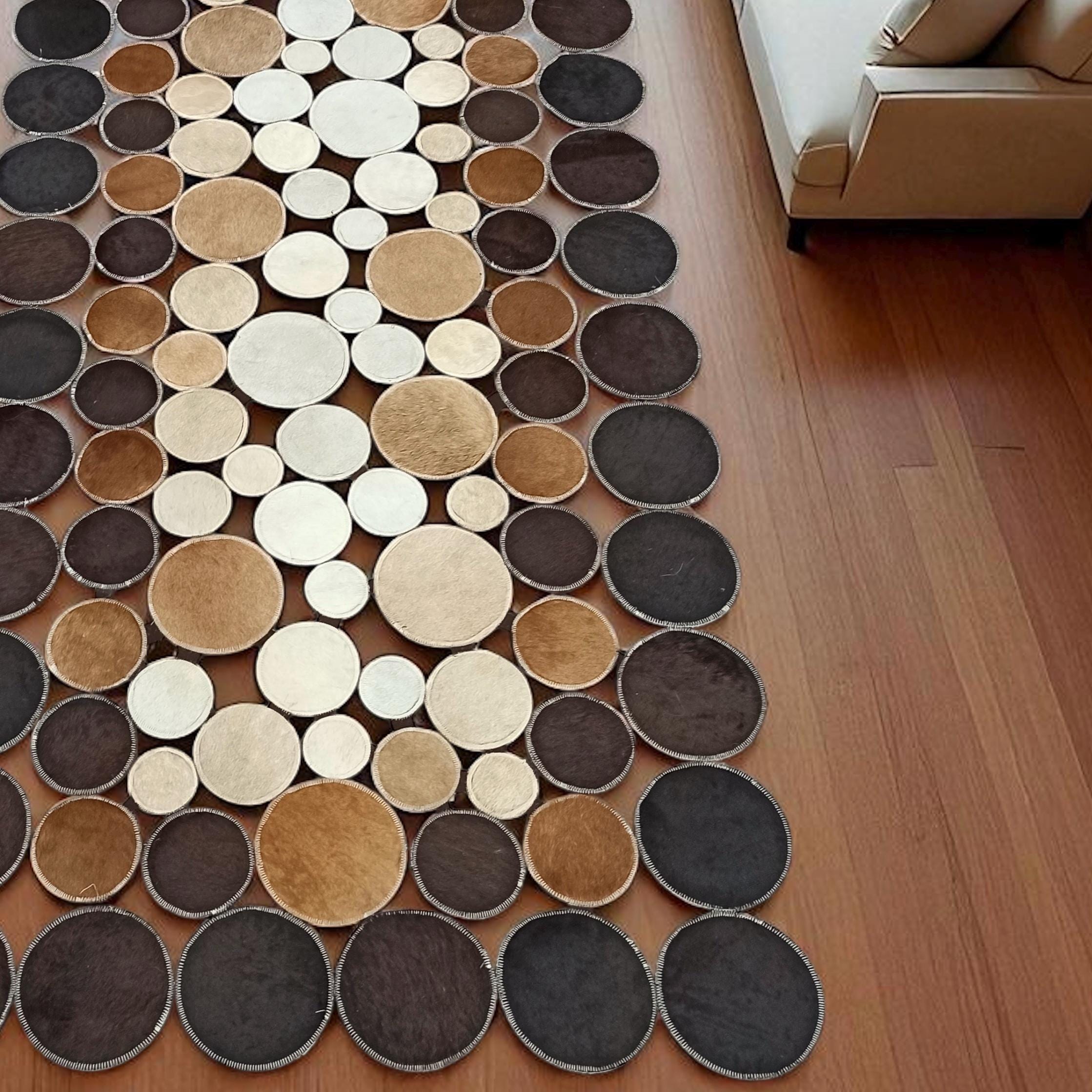 Yolluk formunda gri puantiye desenli bu deri halı, dar alanlara modern bir dokunuş katar. El yapımıdır.
