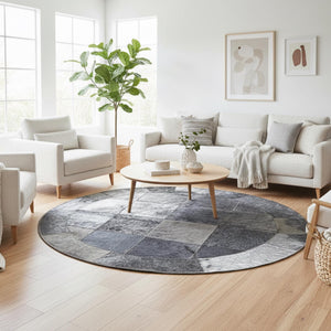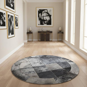 Gri Tonlarında Yuvarlak Dana Derisi Patchwork Halı – El Yapımı, Doğal Deri ve Dekoratif Halı