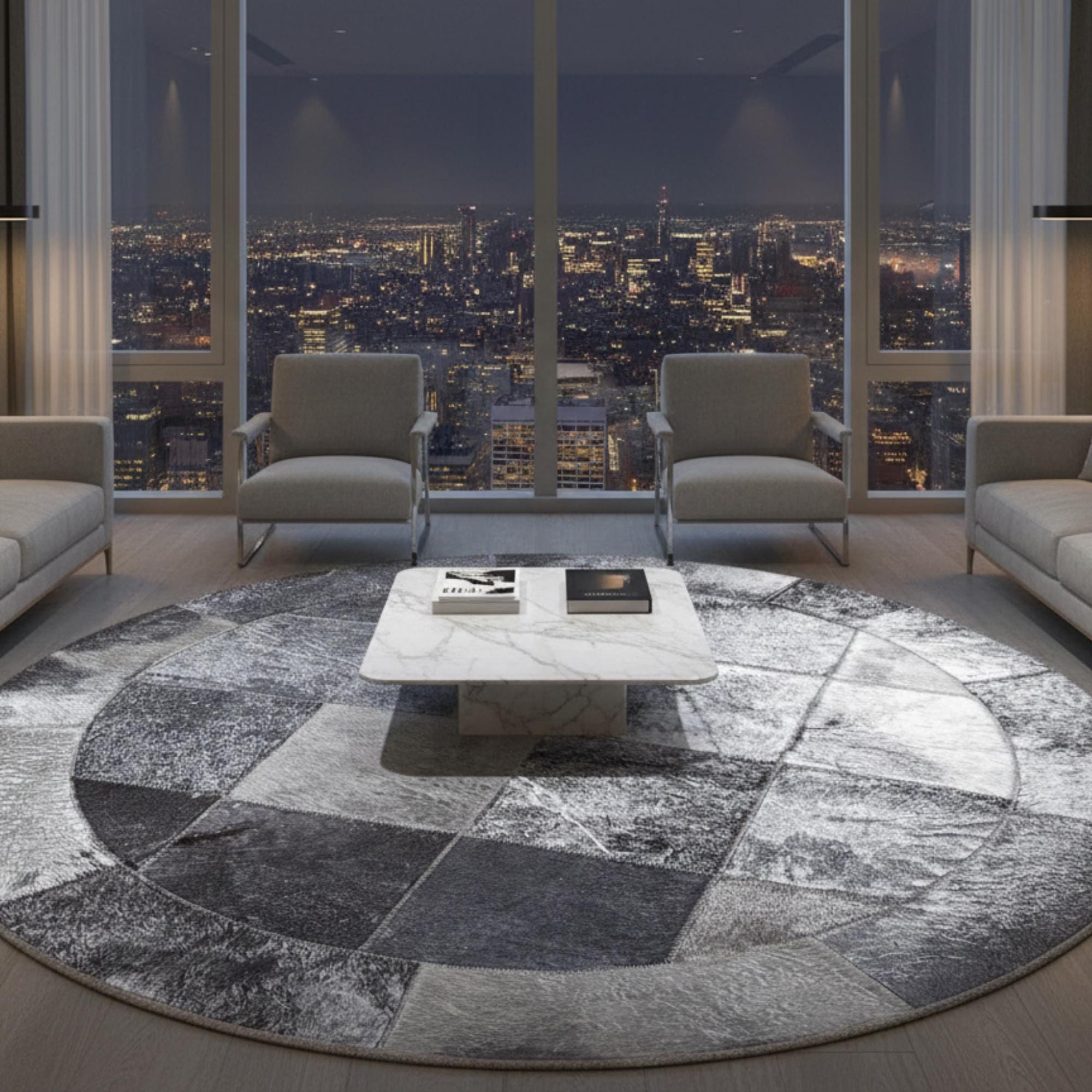 Farklı gri tonlarındaki dana derisi parçalarının uyumlu bir düzenle bir araya getirilmesiyle tasarlanan bu yuvarlak patchwork halı, sade ve dengeli bir görünüm sunar. Ton geçişleri yüzeyde yumuşak bir etki oluştururken, yuvarlak formu sayesinde mekânda düzenli bir odak noktası yaratır.