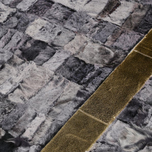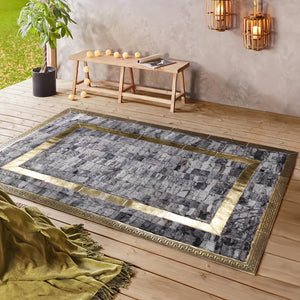Gri tonların doğal geçişleriyle tasarlanan bu Toskana derisi halı, altın şerit ve bordür detaylarıyla şık bir görünüm sunar. El işçiliğiyle hazırlanmış olup her parça benzersizdir.