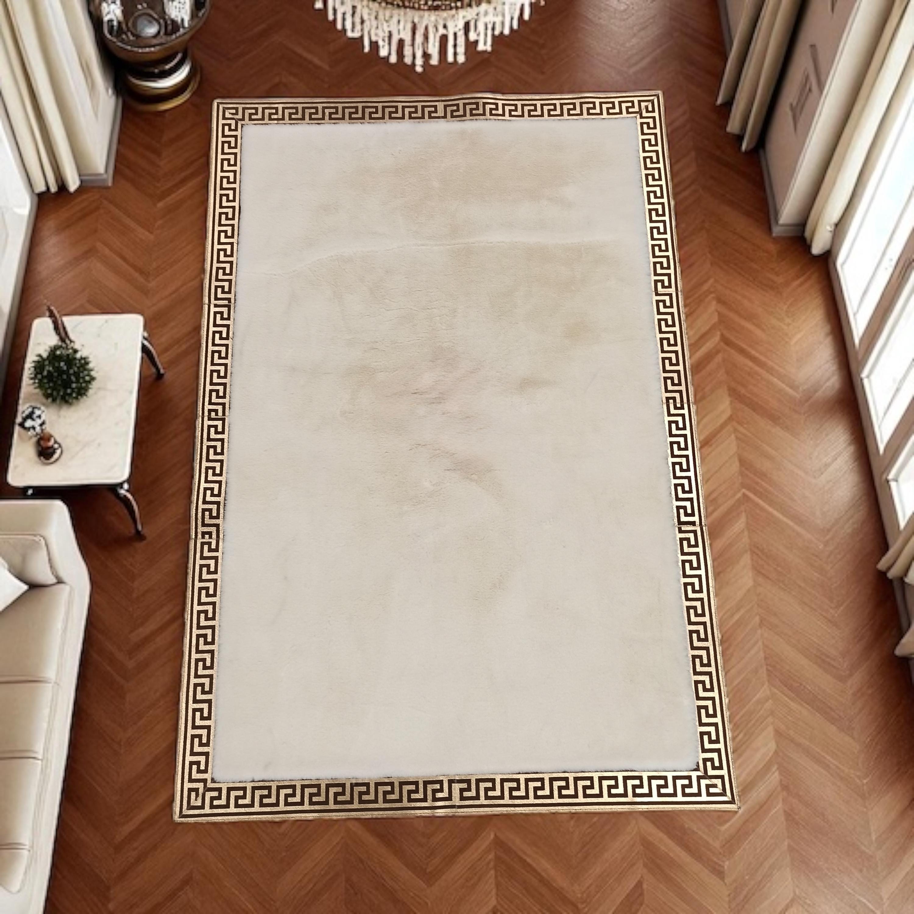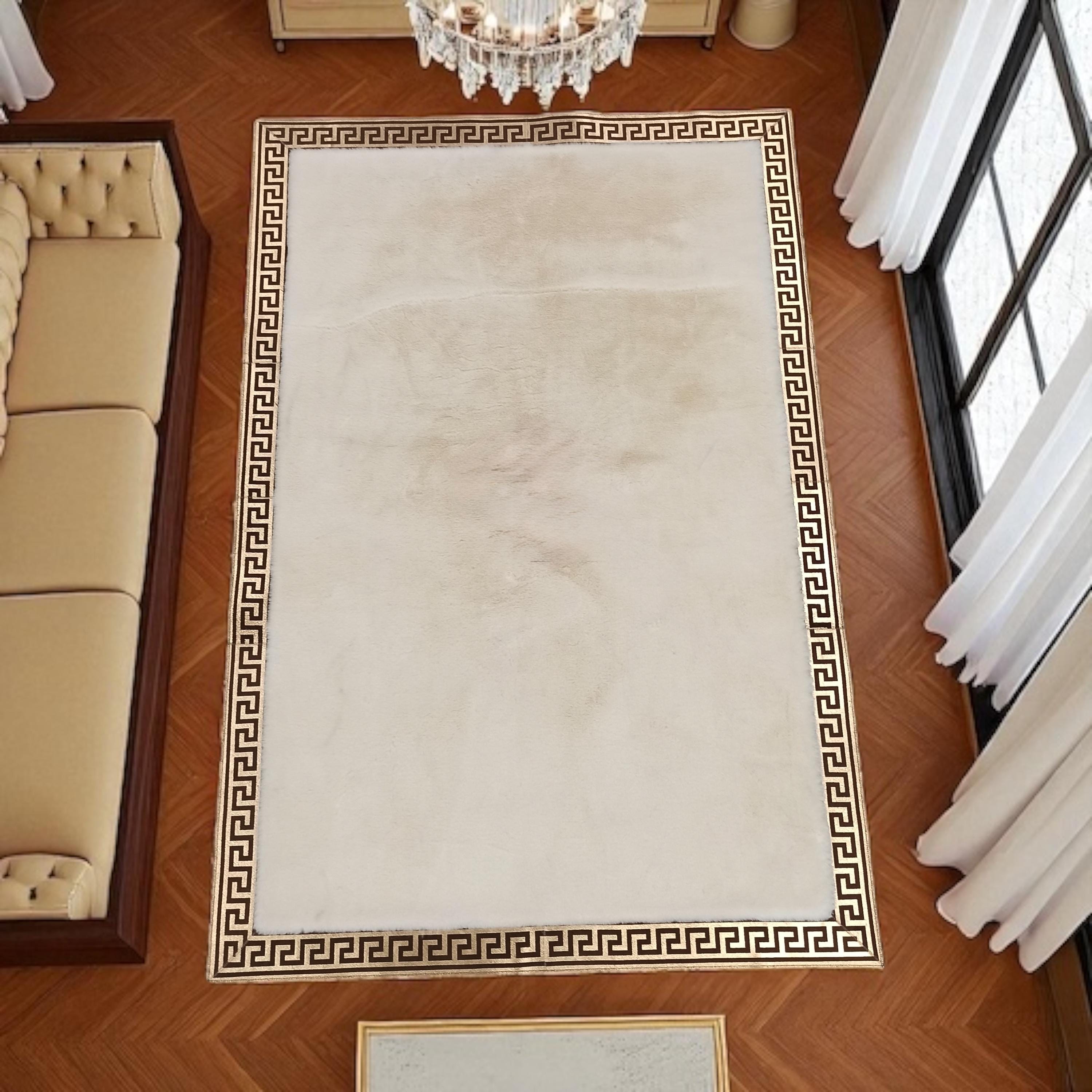 Altın Bordürlü Krem Peluş Halı - Yumuşak Salon Halısı