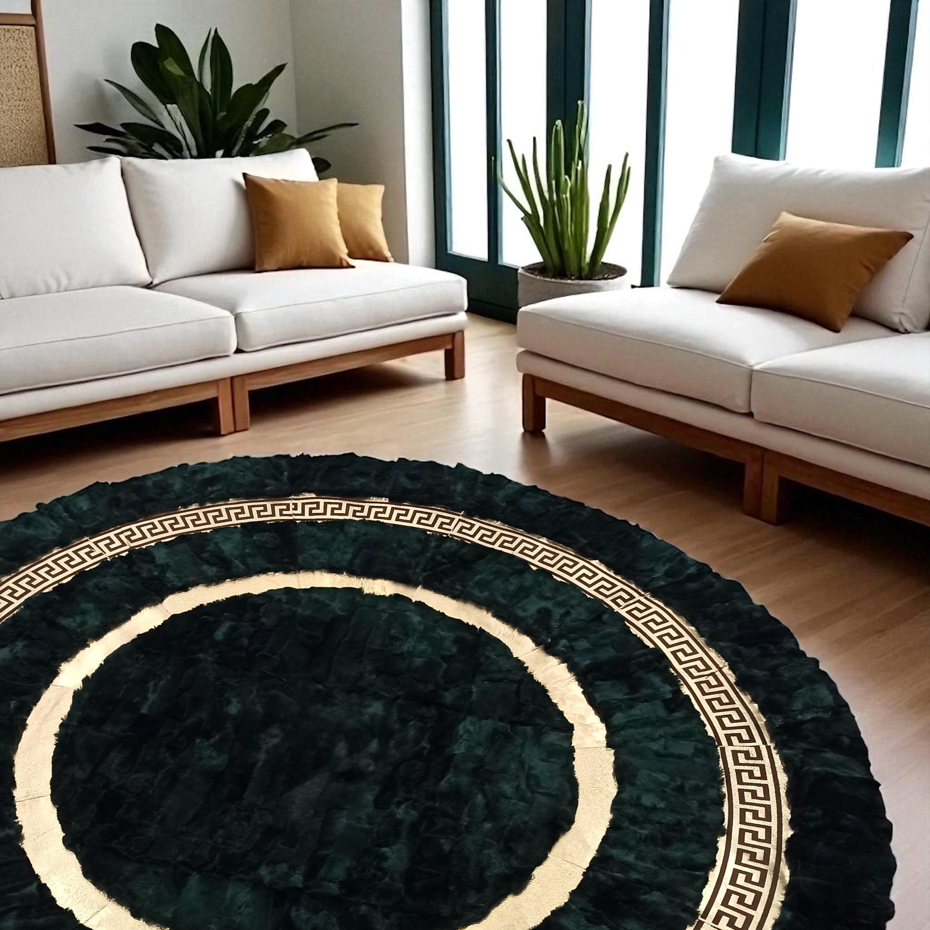 Bu yuvarlak dana derisi halı, el işçiliğiyle hazırlanmış olup doğal yapısıyla dikkat çeker.
