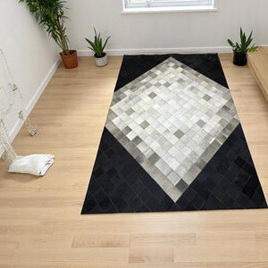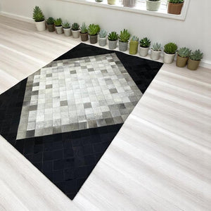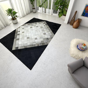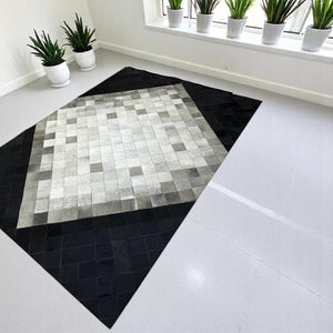 Gri Siyah Dana Derisi Patchwork Halı – El Dokuma Hakiki Deri Şık Salon ve Giriş Halısı