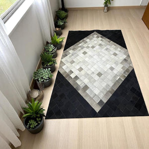 Siyah & gri tonlara sahip bu dana derisi halı, doğal dokusu ve şık görünümüyle dikkat çeker.