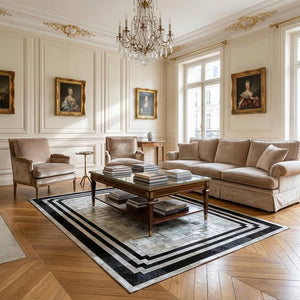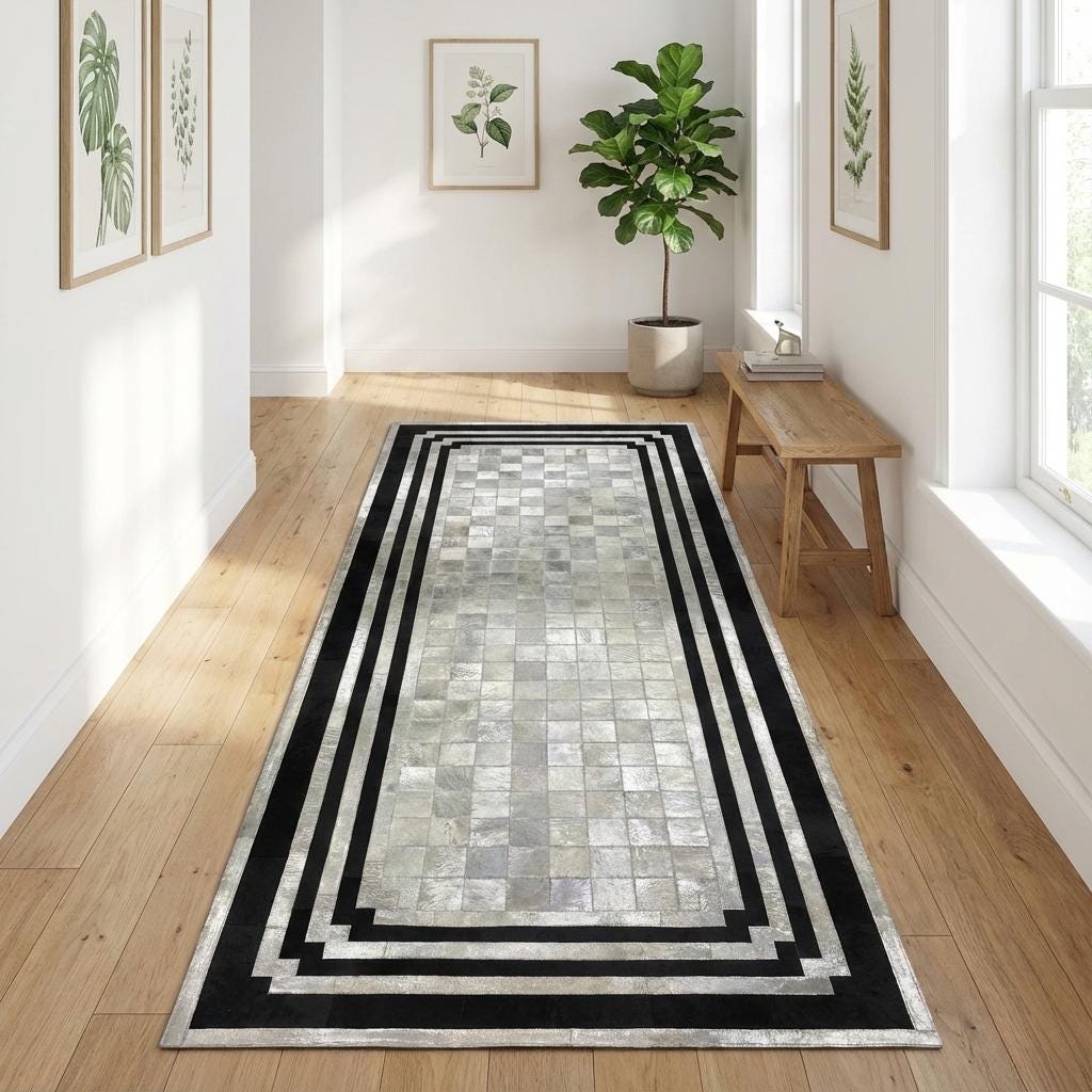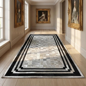 Siyah ve gri tonlarda bordür detaylarıyla tasarlanan dana derisi patchwork halı, düzenli geometrik yapısıyla dikkat çeker. Gerçek dana derisinden üretilen bu halı, doğal dokusu ve dengeli renk geçişleriyle öne çıkar.