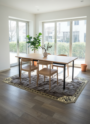 Çerçevesini çevreleyen altın köşe detayları, tasarıma modern ve dekoratif bir dokunuş kazandırırken halının doğal yapısını ön plana çıkarır. Salon, yatak odası, oturma odası ve antre gibi birçok alanda estetik bir tamamlayıcı olarak kullanılabilir.