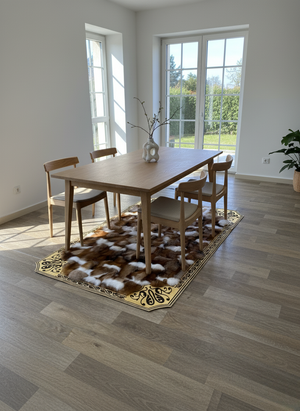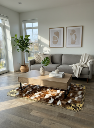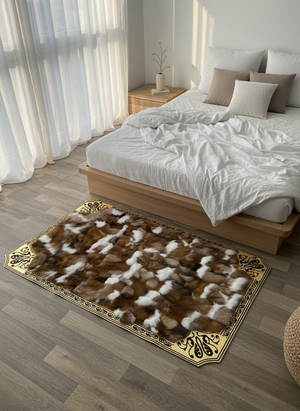 Halının etrafını çevreleyen altın köşe detayları, kürkün doğal tonlarını öne çıkararak dekoratif açıdan güçlü bir etki yaratır. Salon, yatak odası, antre veya oturma odası gibi alanlarda dekoratif bir tamamlayıcı olarak kullanılabilir.