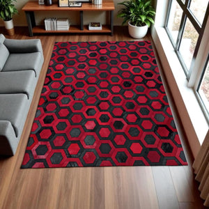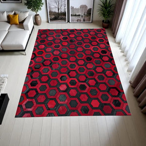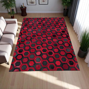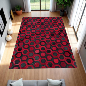 Kırmızı Siyah Dana Derisi Patchwork Halı – Altıgen Desenli El Yapımı Şık Salon Halısı