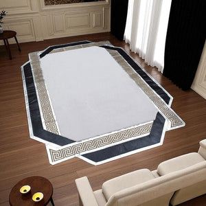 Altın Bordür Detaylı Siyah Beyaz Peluş Halı – El Yapımı Yumuşak ve Şık Salon Halısı