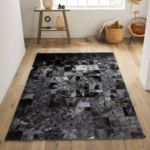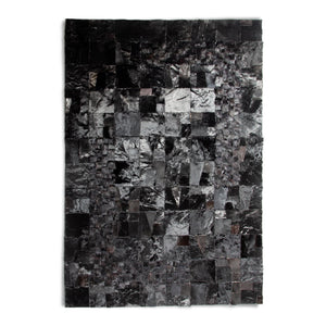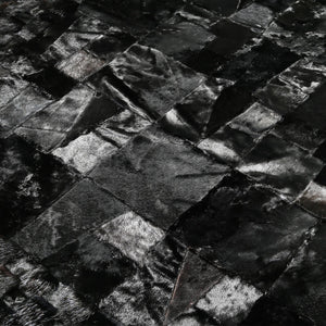 Parlak siyah renkteki bu dana derisi patchwork halı, şık ve sofistike bir görünüm sunar. Uzun ömürlü yapısıyla kullanışlıdır.