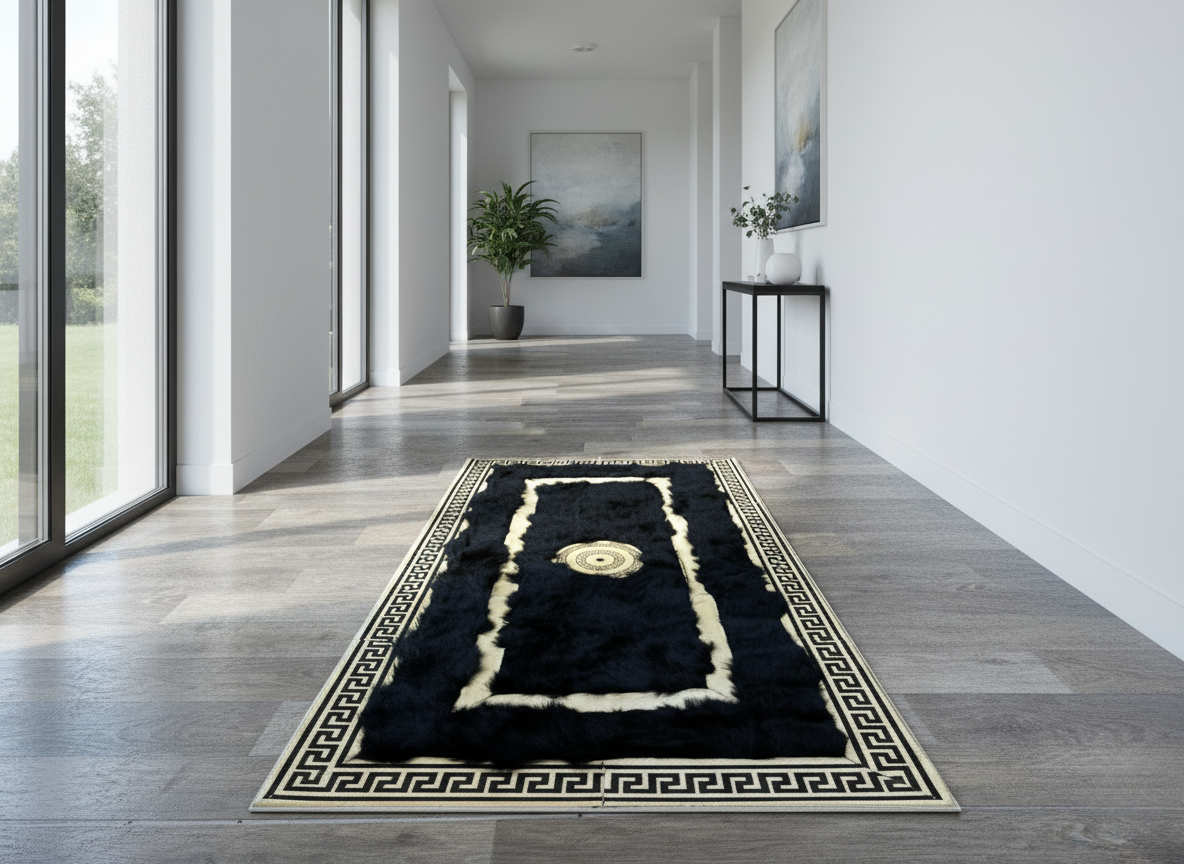 Bu siyah Toskana halı, doğal kürk dokusunun verdiği yoğun ve zarif görünümü modern detaylarla birleştirir. Zengin Toskana yüzeyi adım attığınız anda yumuşak, sıcak ve dolgun bir his sunarken, halının ortasındaki altın işlemeli detay tüm mekânda şık bir odak noktası oluşturur.