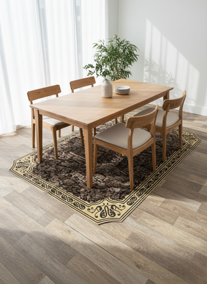 Çerçevesindeki altın köşe detayları, halıya zarif bir dokunuş katarak yaşam alanlarında şık bir odak noktası oluşturur. Yatak odası, salon, oturma odası ve antre gibi farklı alanlarda dekoratif bir tamamlayıcı olarak rahatlıkla kullanılabilir.