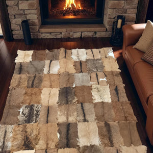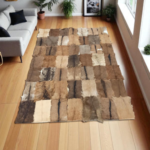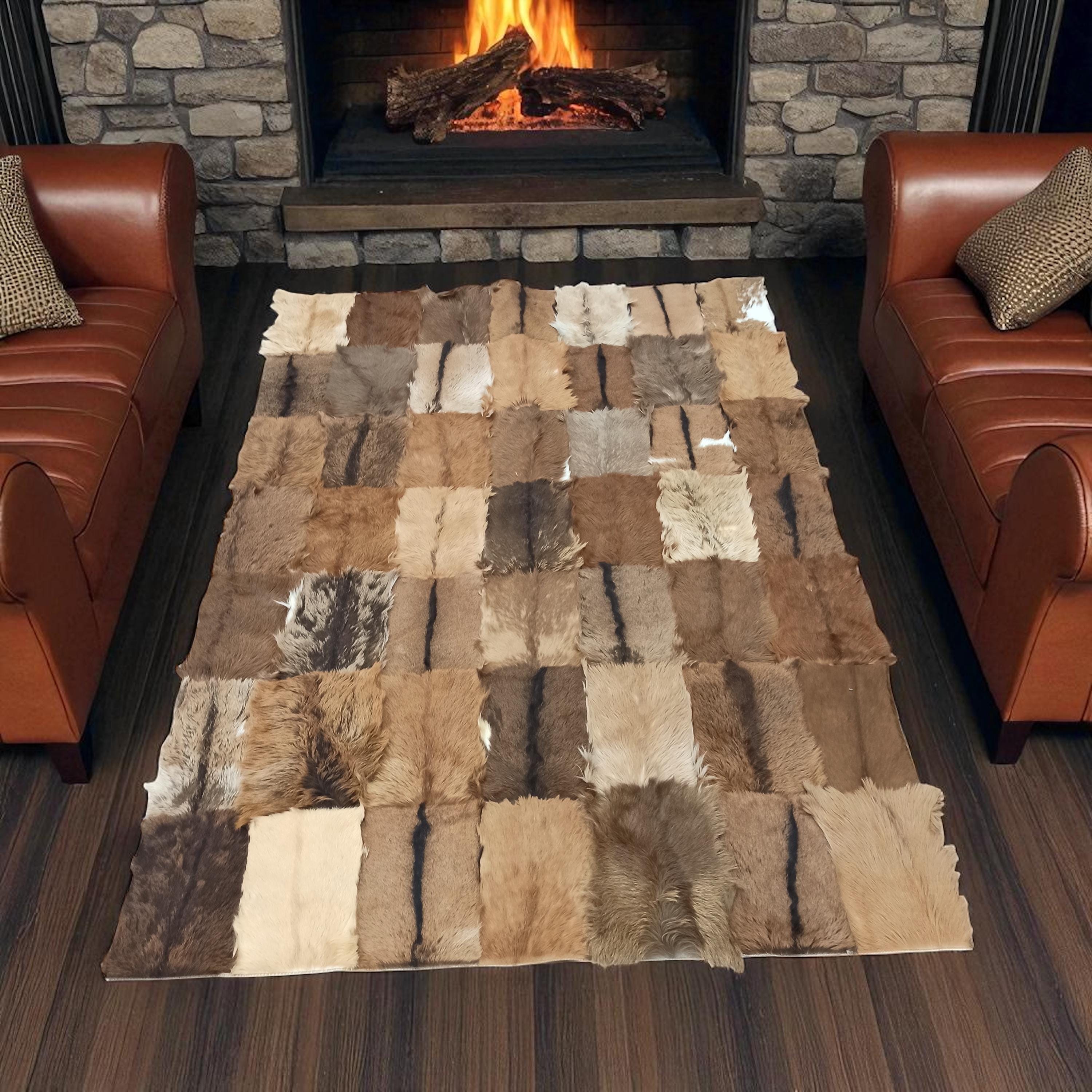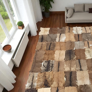 Kahverengi Patchwork Oğlak Derisi Halı – El Yapımı Doğal Deri Halı, Kare Desenli Lüks ve Dekoratif Salon Halısı
