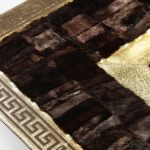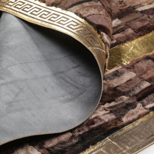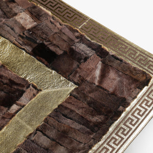 Kahverengi tonlarının doğal dokusunu taşıyan bu Toskana derisi halı, altın çerçeve ve bordür detayıyla şıklık kazandırır. El işçiliğiyle üretilmiş olup her parça kendine özgüdür.